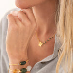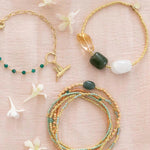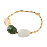 The Desirable Aventurine Bracelet Gold-Colored features 3 large, smooth oval gemstones: moonstone, citrine, and aventurine, with gold-colored glass beads. Strung on elastic, the bracelet has an inner size of 16 centimeters, making it easy to wear. Perfect to wear alone or stacked with other jewelry. Moonstone enhances intuition and balance, citrine fills every moment with joy and happiness, and aventurine encourages you to follow your own path.