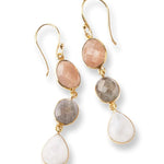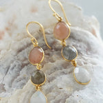 Näissä upeissa 22 karaatin kullatuissa roikkuvissa korvakoruissa on 3 fasetoitua jalokiveä, jotka ovat persikkainen kuukivi, kuukivi ja labradoriitti. Kauniit korvakorut näyttävämpään lookkiin.