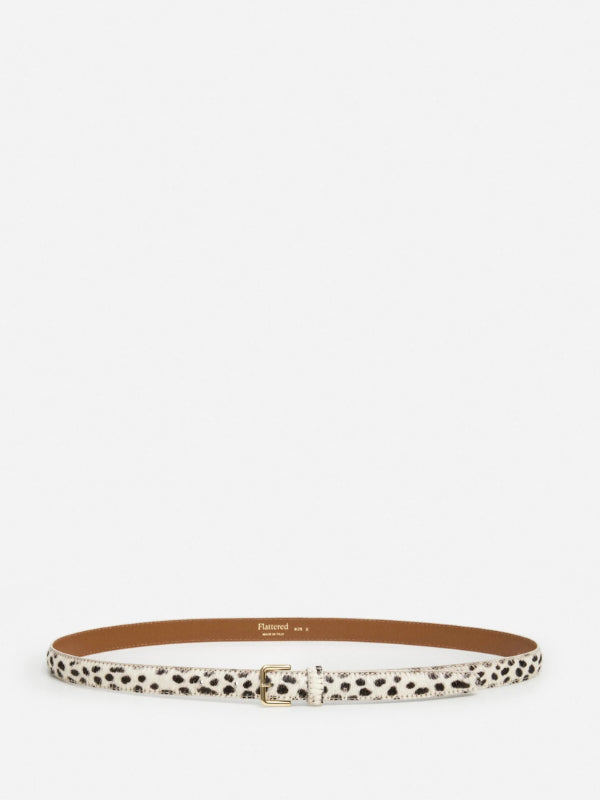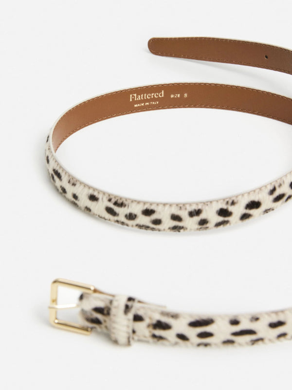 Flatteredin minimalistinen nahkavyö näyttävällä leopardikuosilla. Klassinen malli kultaisilla yksityiskohdilla. Saatavilla koossa S, M ja L.
