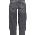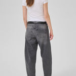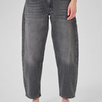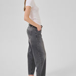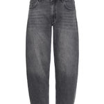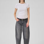 Barrel-malliset farkut, joissa kiva harmaa retropesu. Farkuissa on korkea vyötärö ja materiaali joustaa hieman. Lyhyempi malli (pituus 28'). Yhdistä valkoisen teepparin ja vyön kanssa.