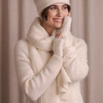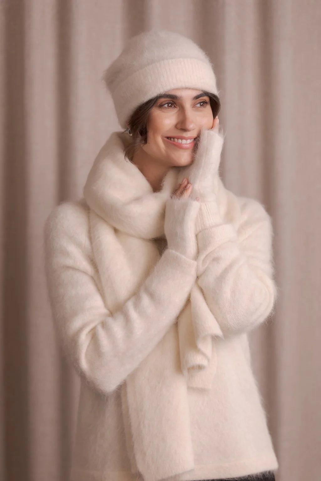Alpakkasekoitekynsikkäät ovat lämpimän pehmeät ja käytännölliset. Korkealaatuisesta alpakkasekoitteesta valmistetut kynsikkäät ovat pörröiset ja tuntuvat miellyttäviltä ihoa vasten. Ne tarjoavat lämpöä kylmemmissä sääolosuhteissa ja säilyttävät samalla sormet vapaana, mikä tekee niistä ihanteelliset puhelimen tai avainten käsittelyyn. Yhdistä kynsikkäät alpakkasekoitesarjan muihin asusteisiin luodaksesi harmonisen kokonaisuuden.