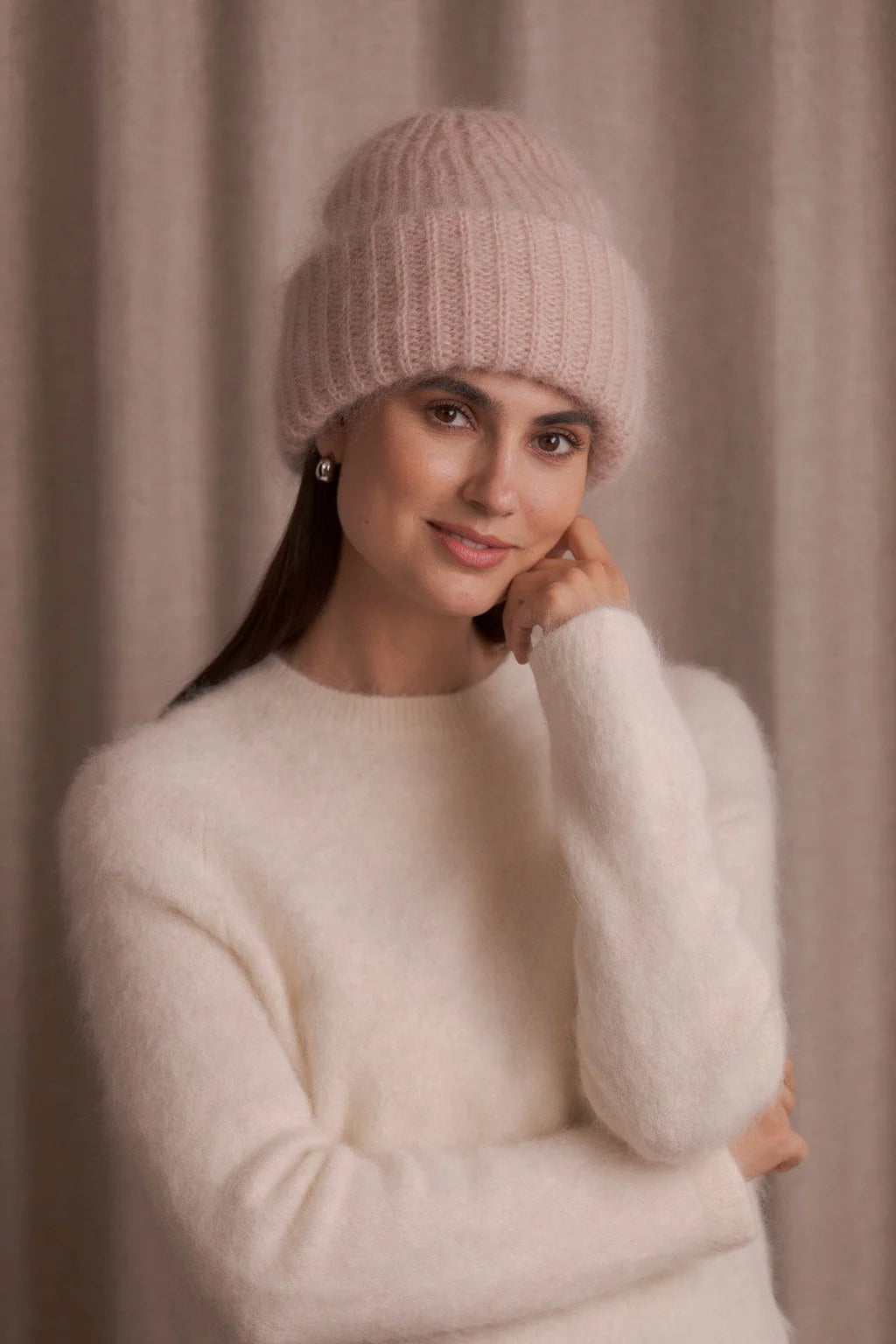 Italialaisesta langasta neulottu tyylikäs ja muhkea pipo suojaa tehokkaasti kylmältä säältä. Pipo on valmistettu pehmeän kid mohairin ja lämpimän villan yhdistelmästä, mikä tekee piposta pehmeän ja lämpimän.