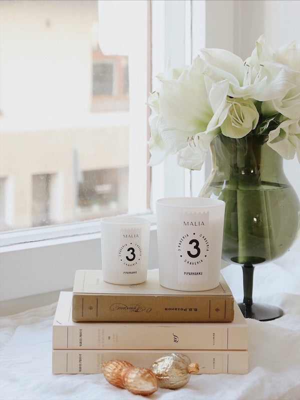 Kotimaisen MALIA:n soijavahasta käsityönä valmistettu tuoksukynttilä Piparkakku-tuoksussa.