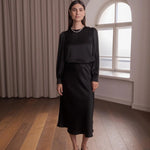 Pitkähihainen satiinipaita, jossa näyttävät puhvihihat ja hihansuissa kangaspäällysteiset napit. Modernit sivuhalkiot ja takaa pidempi helmalinja tuovat asuun keveyttä ja liikkuvuutta.