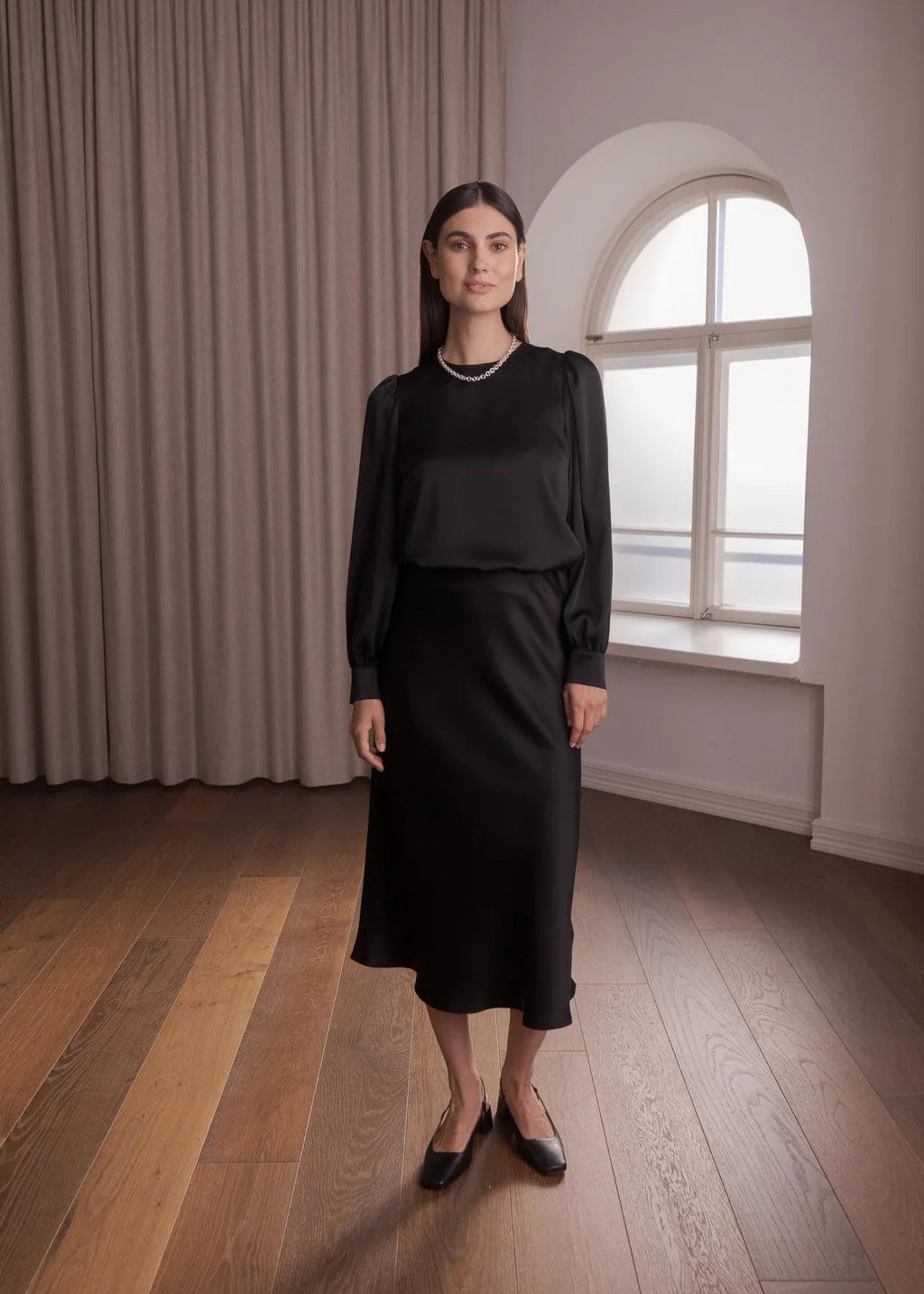 Pitkähihainen satiinipaita puhvihihalla, Black