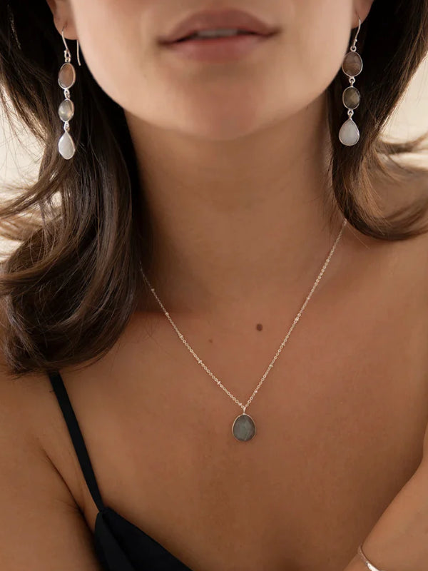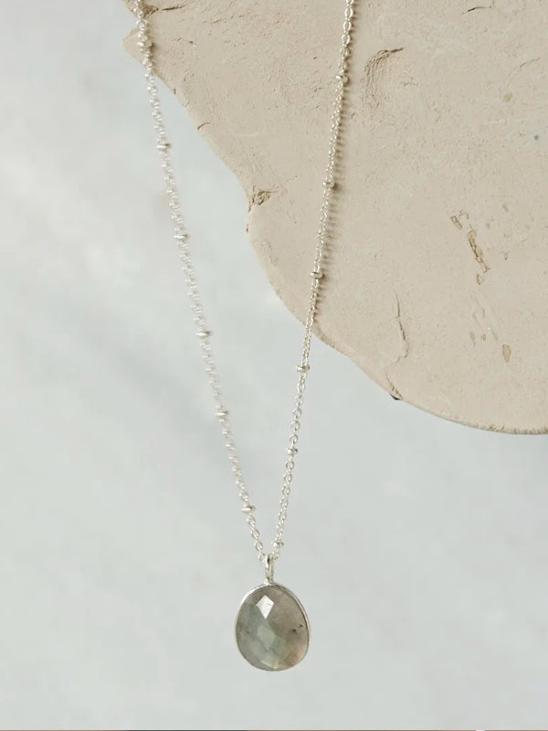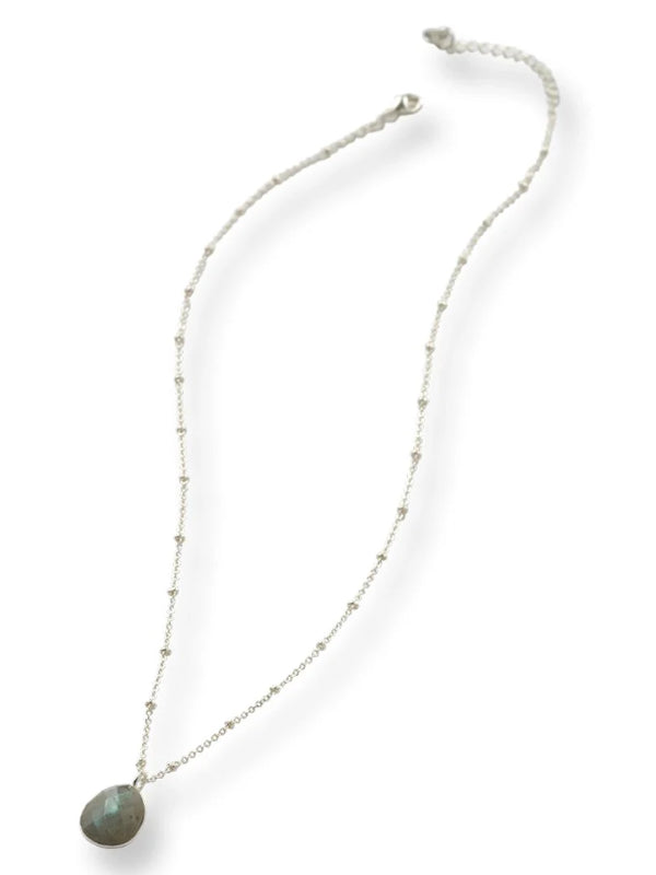 Fasettihiottu pisaran muotoinen riipus labradoriitti jalokivellä. Labradoriitti symboloi menestystä, intuitiota ja itsetutkiskelua.