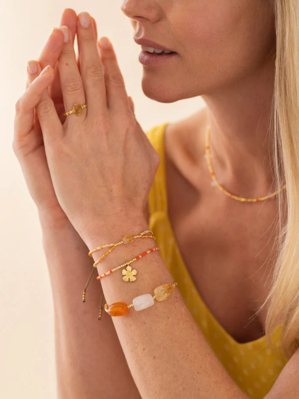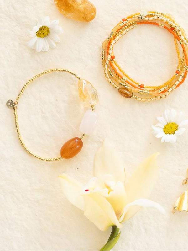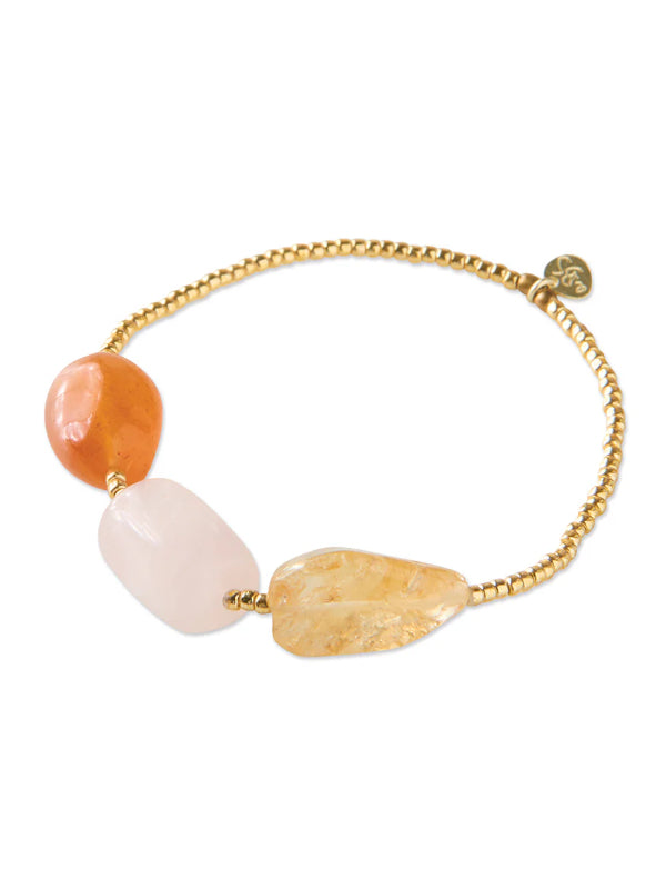 The Desirable Carnelian Rose Quartz Citrine Bracelet Gold Colored showcases 3 large, smooth oval gemstones: carnelian, rose quartz, and citrine, with gold-colored glass beads. Strung on elastic, the bracelet has an inner size of 16 centimeters, ensuring effortless wear. Ideal for wearing solo or stacking with other jewelry. Carnelian sparks movement and creativity, rose quartz brings love and harmony, and citrine fills every moment with joy and happiness.