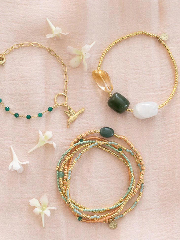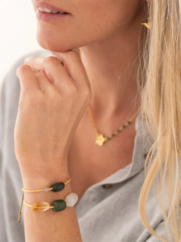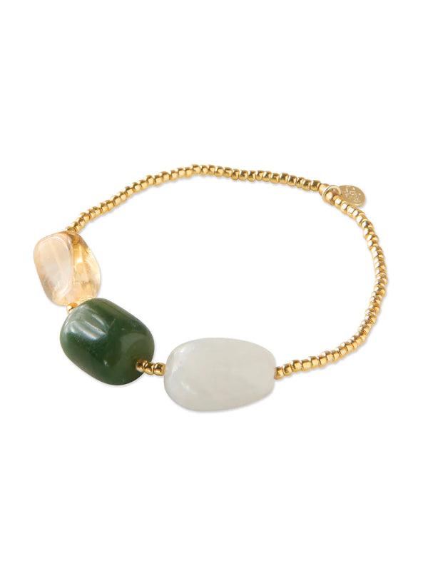 The Desirable Aventurine Bracelet Gold-Colored features 3 large, smooth oval gemstones: moonstone, citrine, and aventurine, with gold-colored glass beads. Strung on elastic, the bracelet has an inner size of 16 centimeters, making it easy to wear. Perfect to wear alone or stacked with other jewelry. Moonstone enhances intuition and balance, citrine fills every moment with joy and happiness, and aventurine encourages you to follow your own path.