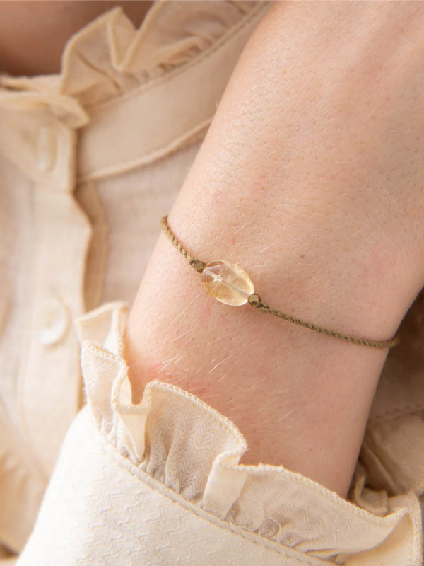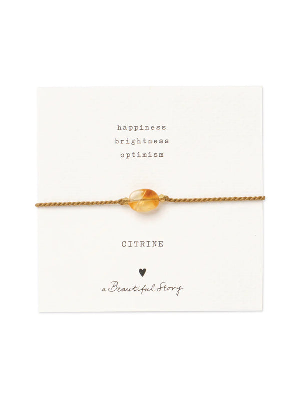 This Gemstone Card Citrine Gold Colored is a handmade bracelet by A Beautiful Story. It is made of a cotton thread and features a citrine gemstone. The bracelet has a sliding knot of cotton thread.