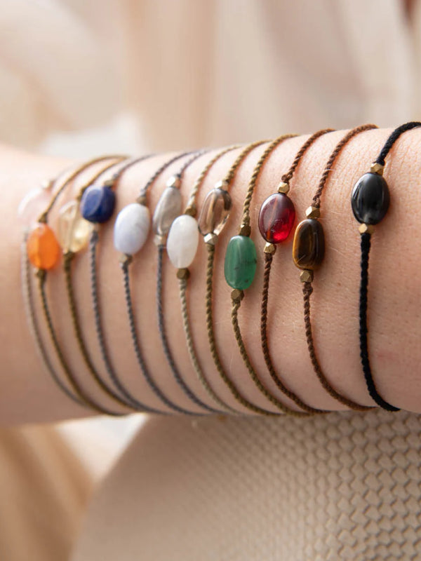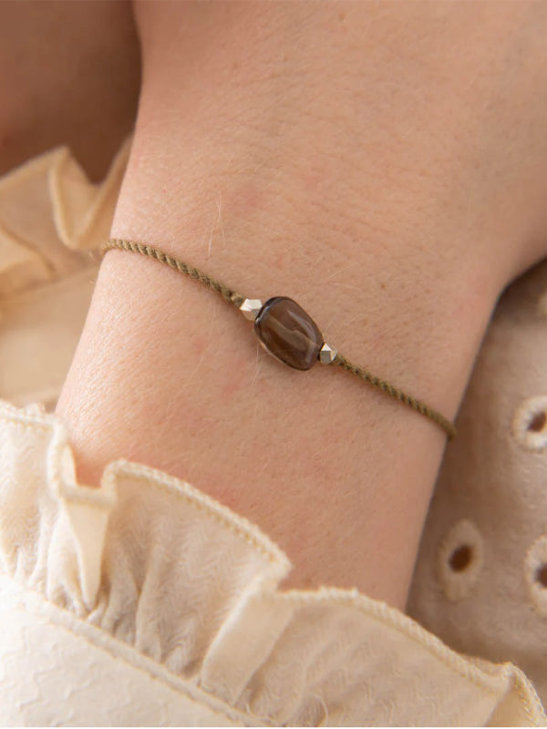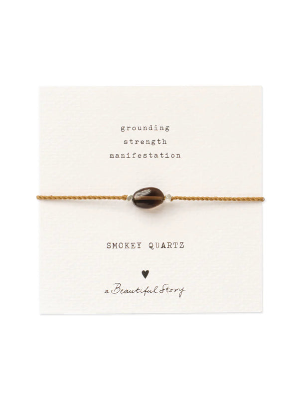 This Gemstone Card Smokey Quartz Silver Colored is a handmade bracelet by A Beautiful Story. It is made of a cotton thread and features a smokey quartz gemstone. The bracelet has a sliding knot of cotton thread.