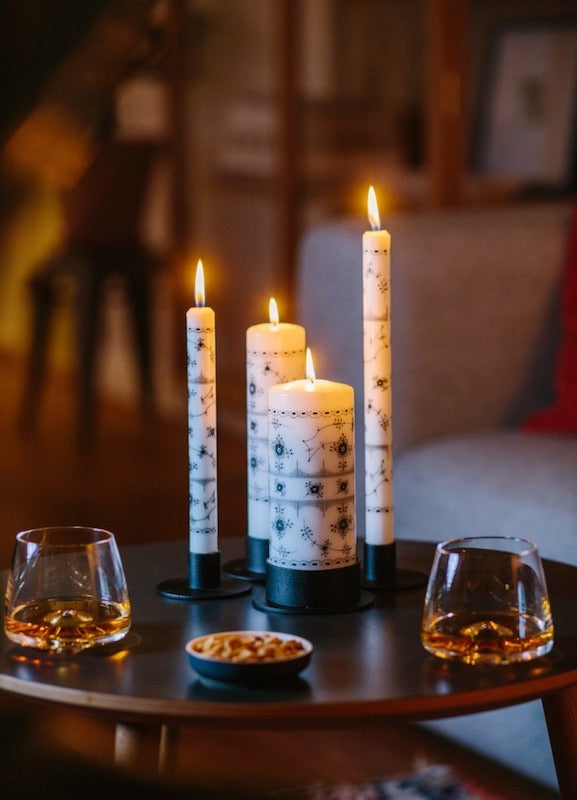 Kaunis klassinen kuviokynttilä, jossa porsliinista lainattu kuviointi. Tämä kynttilä on ensimmäinen kuviokynttilä, joka on saanut ympäristömerkinnän. Kuvio on tehty vesipohjaisilla väreillä.