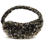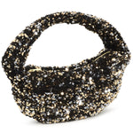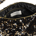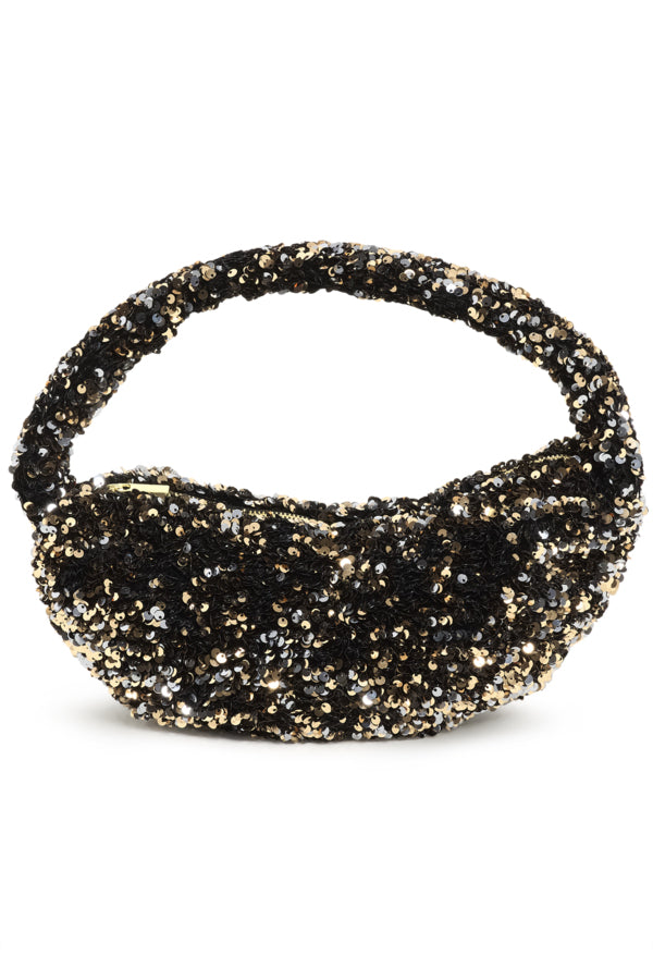 Laukussa mustia, kullan ja hopean värisiä paljetteja.