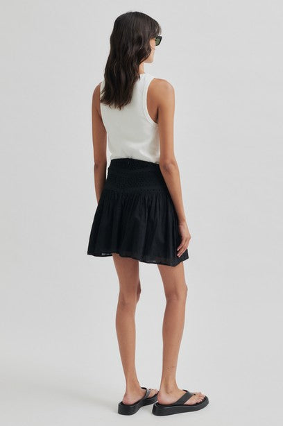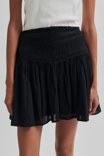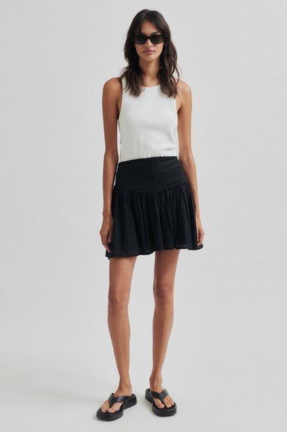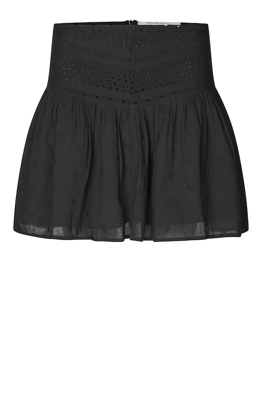 Second Femalen kaunis broderie anglaise kuvioitu minihame, jossa vyötäröllä piilovetoketju. Vyötäröltä tyköistuva, helmasta leveä malli. Tämä hame toimii asusteita ja yläosaa vaihtamalla päivä- ja ilta-asuna. Materiaalina pehmoinen puuvilla. Kokonaan vuoritettu.