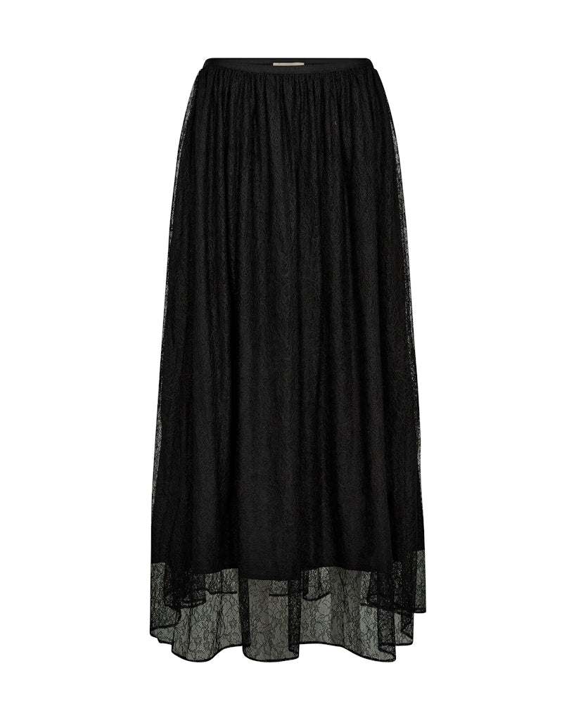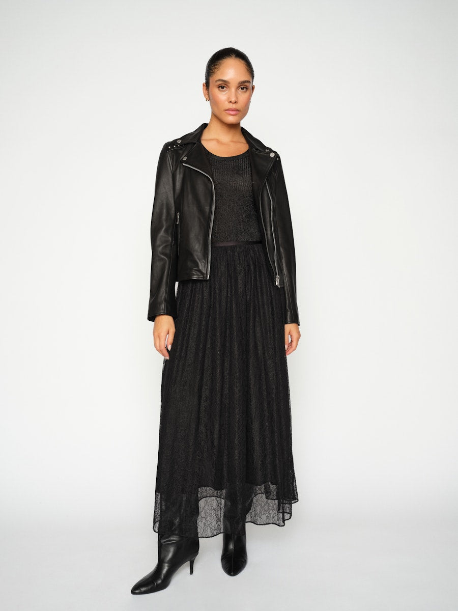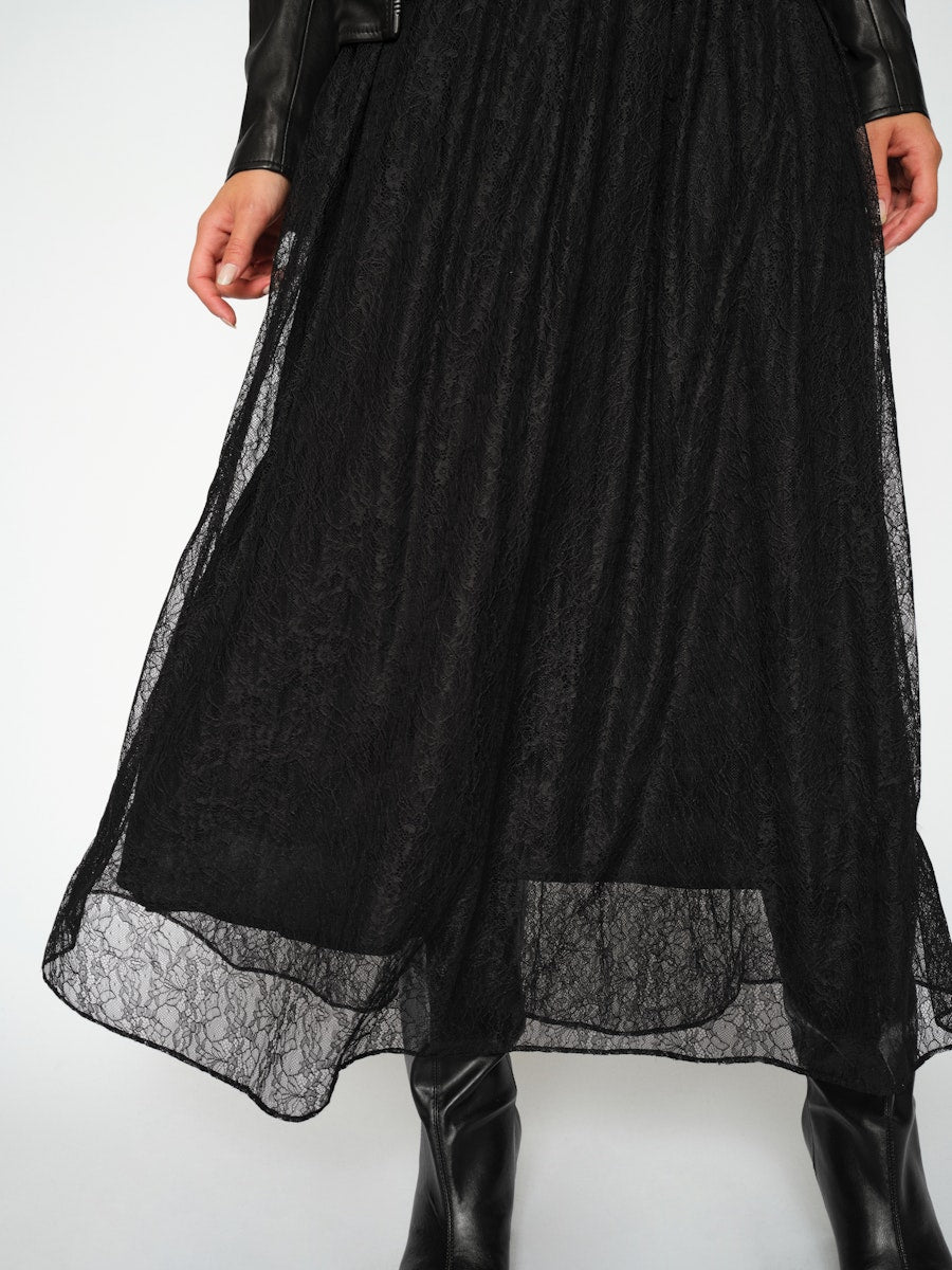 Ihastuttava pitsihame, jossa mukana hieman pitsiosaa lyhyempi alushame. Tyyliä nahkatakin tai neuleen kanssa. Täydellinen myös loppuvuoden juhliin! Tämä A-linjainen maxihame tuo taatusti asennetta asuusi! Huom. Hame on täysimittainen ja ulottuu nilkkoihin asti, ja sopii loistavasti esimerkiksi korkokenkien tai bootsien kanssa.