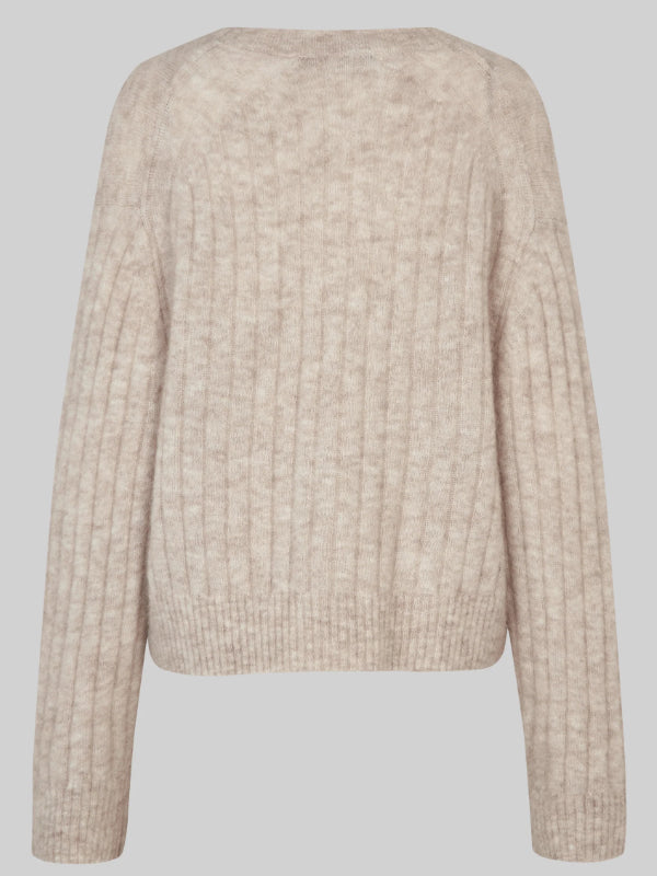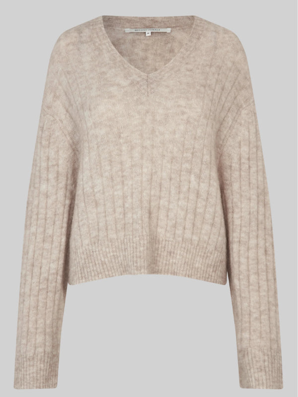 Second Femalen ribattu neulepusero V-kaula-aukolla. Tämä pehmeä ja joustava neule on valmistettu mohair-villasekoitteesta ja siinä on hieman pörröinen tekstuuri. Villaneuleen kaula-aukossa, hihoissa ja helmassa on ohuempi ribattu neulos. Rento malli.