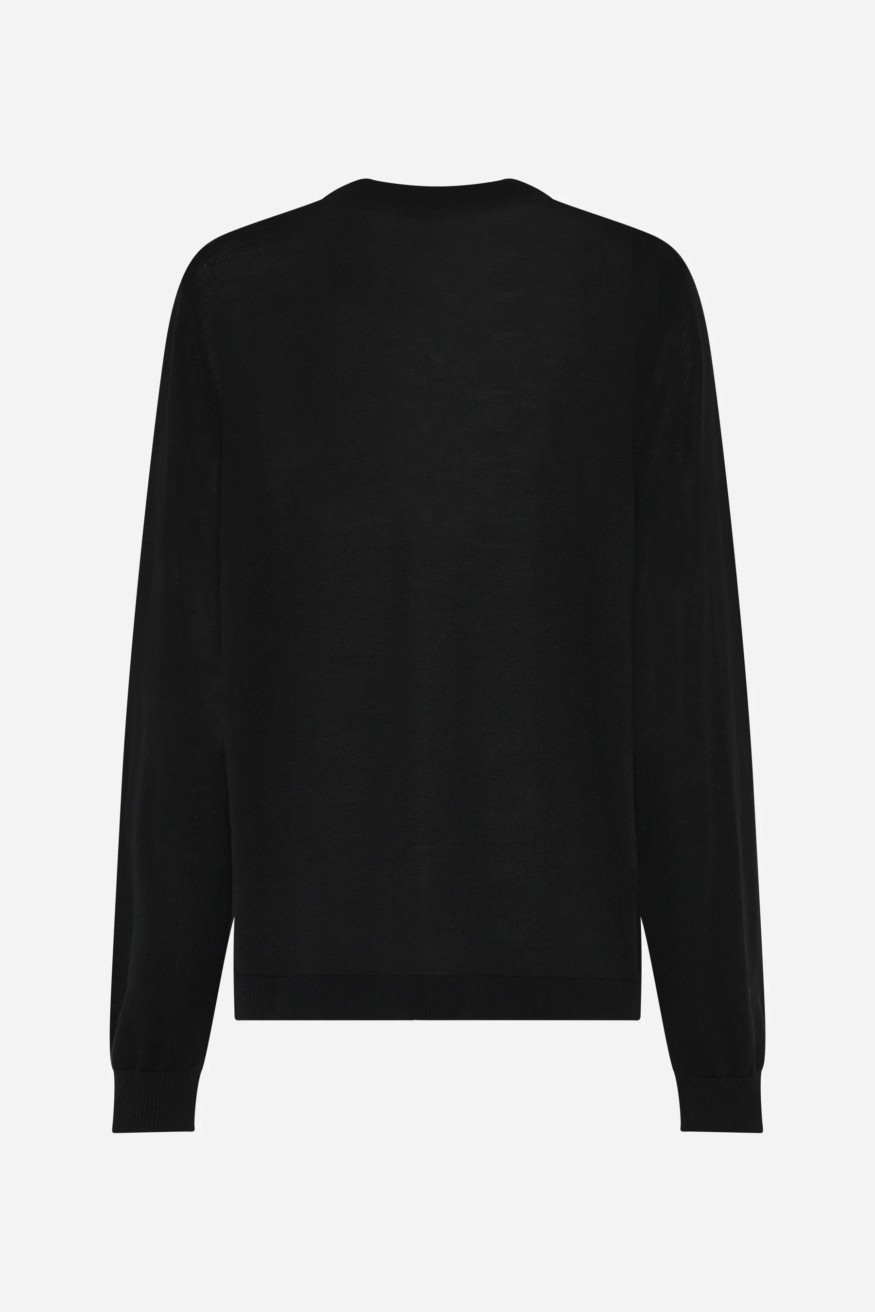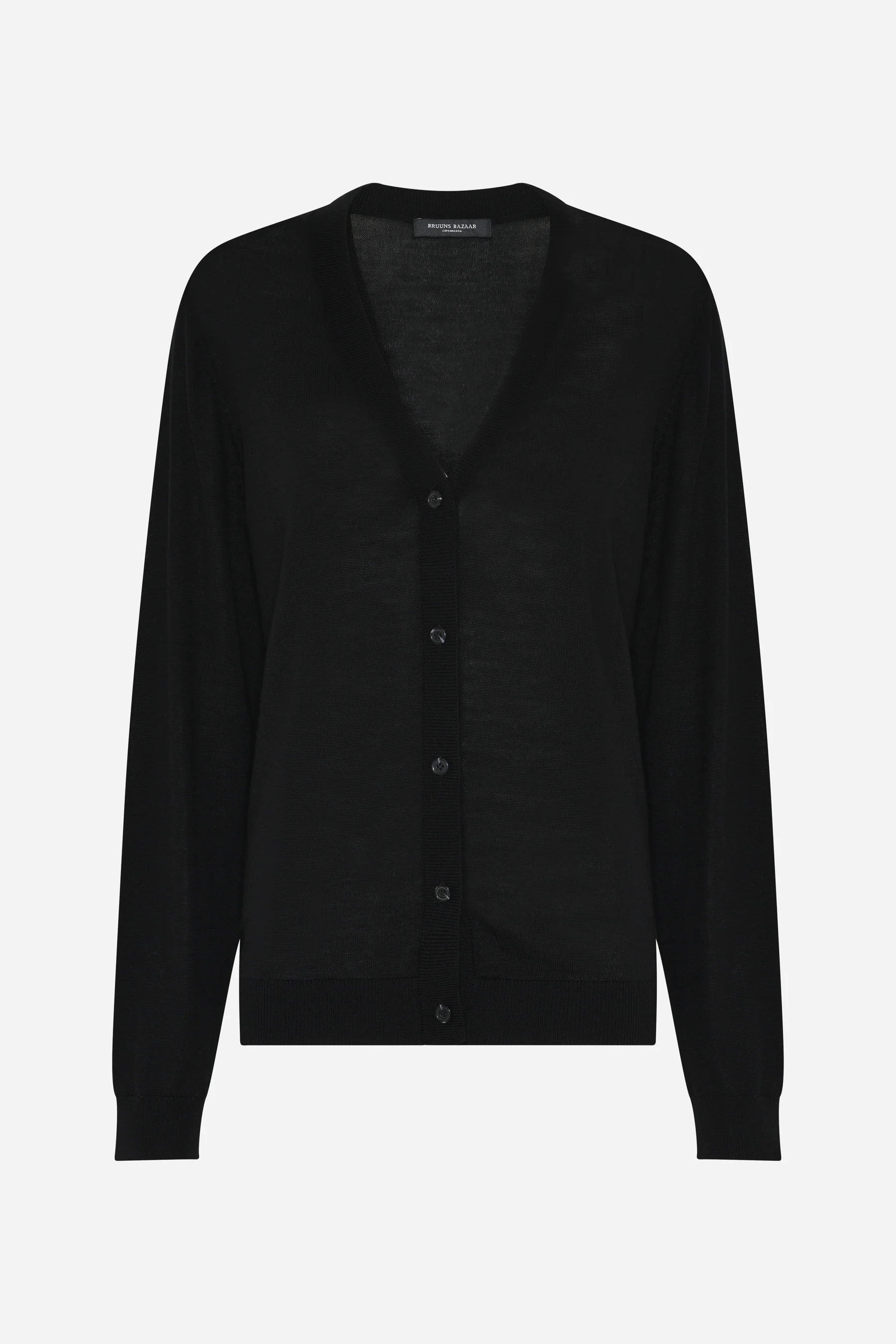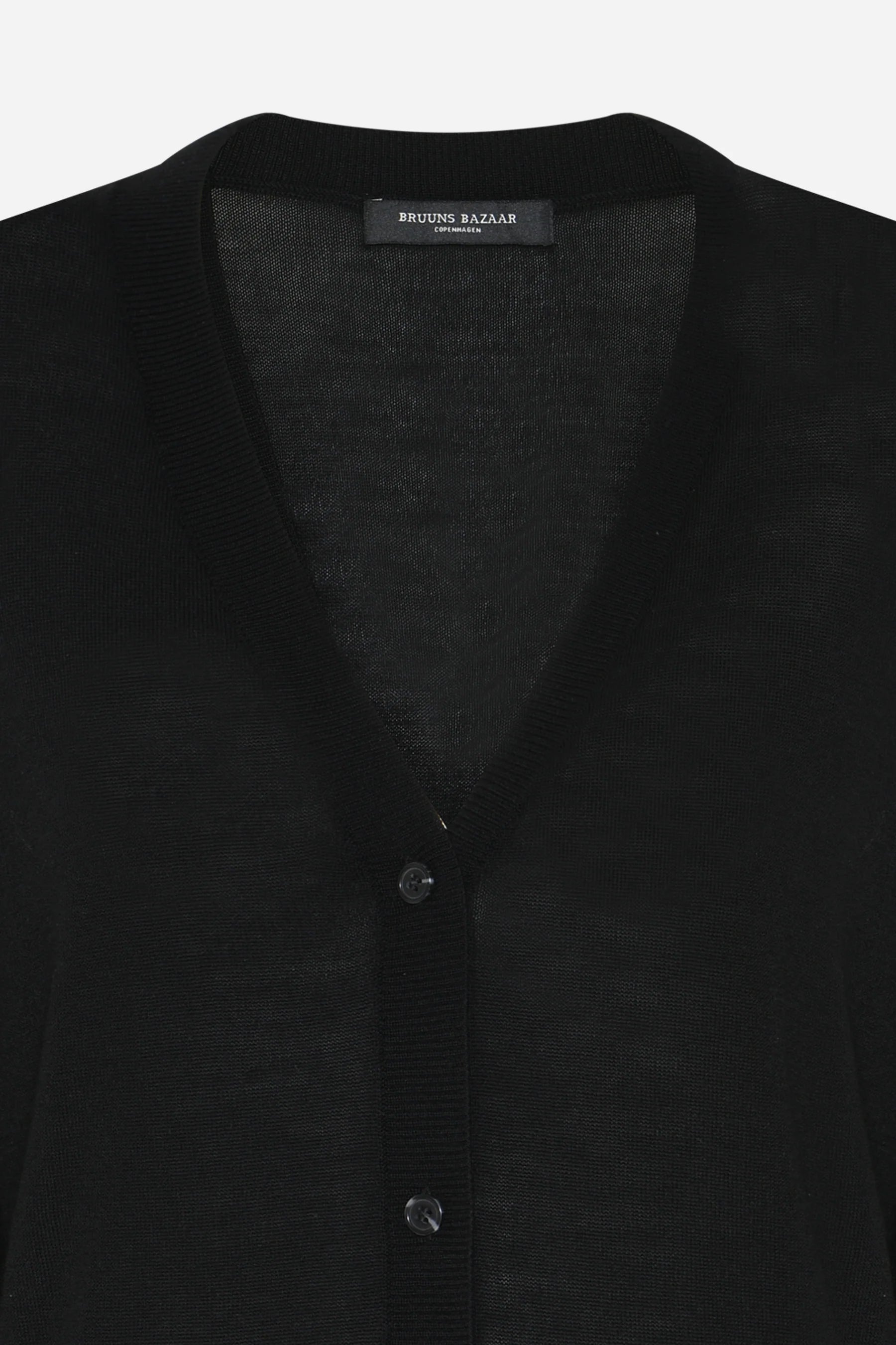Bruuns Bazaarin vähän pidempi neuletakki, jossa klassinen malli v-kaula-aukolla ja mustilla napeilla. Ihana neuletakki monenlaiseen asukokonaisuuteen! Materiaalina sertifioitu villa.