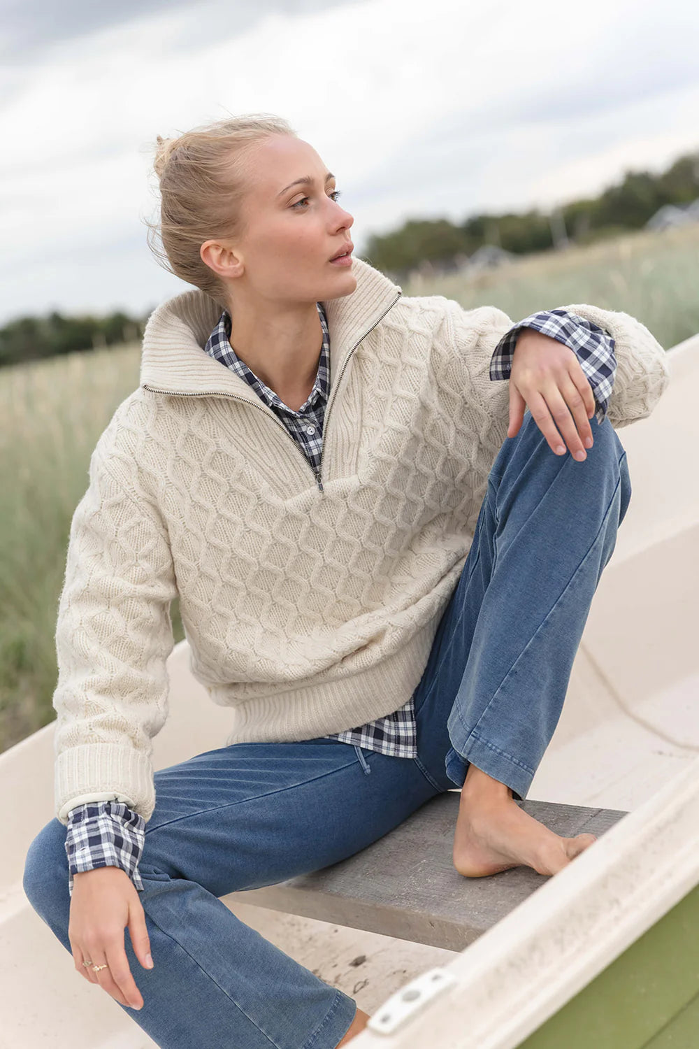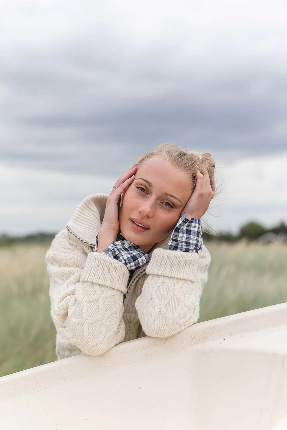 Blue Sportswearin syysuutuudet saapuivat. Tässä villaneuleessa on tuulenpitävä vuorikangas. Vetoketju pystykauluksessa. Ihastuttava palmikkoneule syksyn ulkoiluun, veneelle ja retkeilyyn.