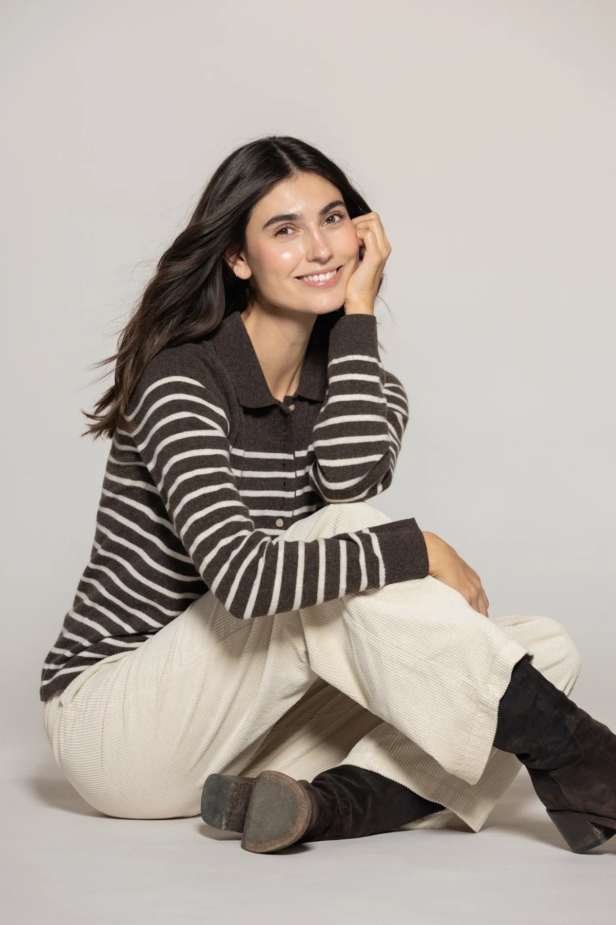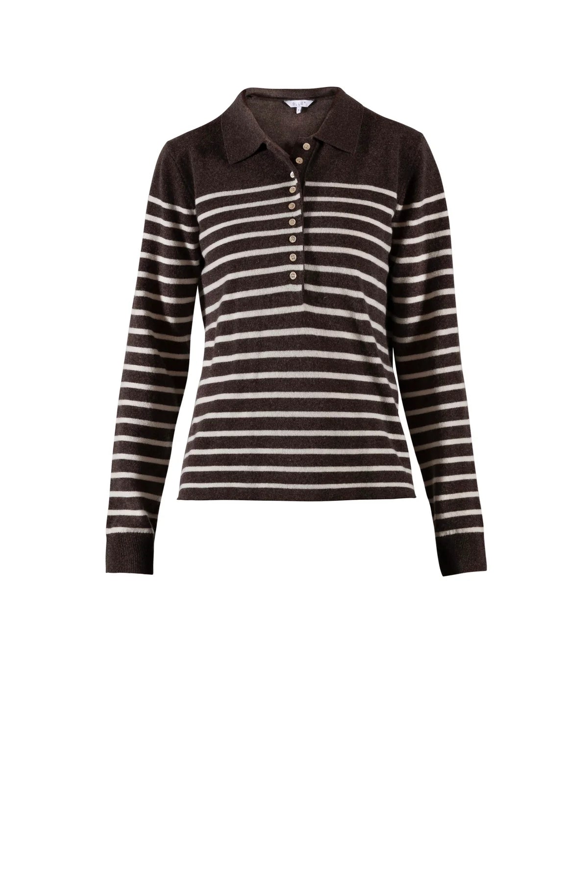 Ihana raidallinen polo neule syksyyn farkkujen tai suorien housujen kaveriksi. Paitiskaulukset ja napitus kauluksessa. Syksyn ihana suklaanruskea sävy. 100% villaa.