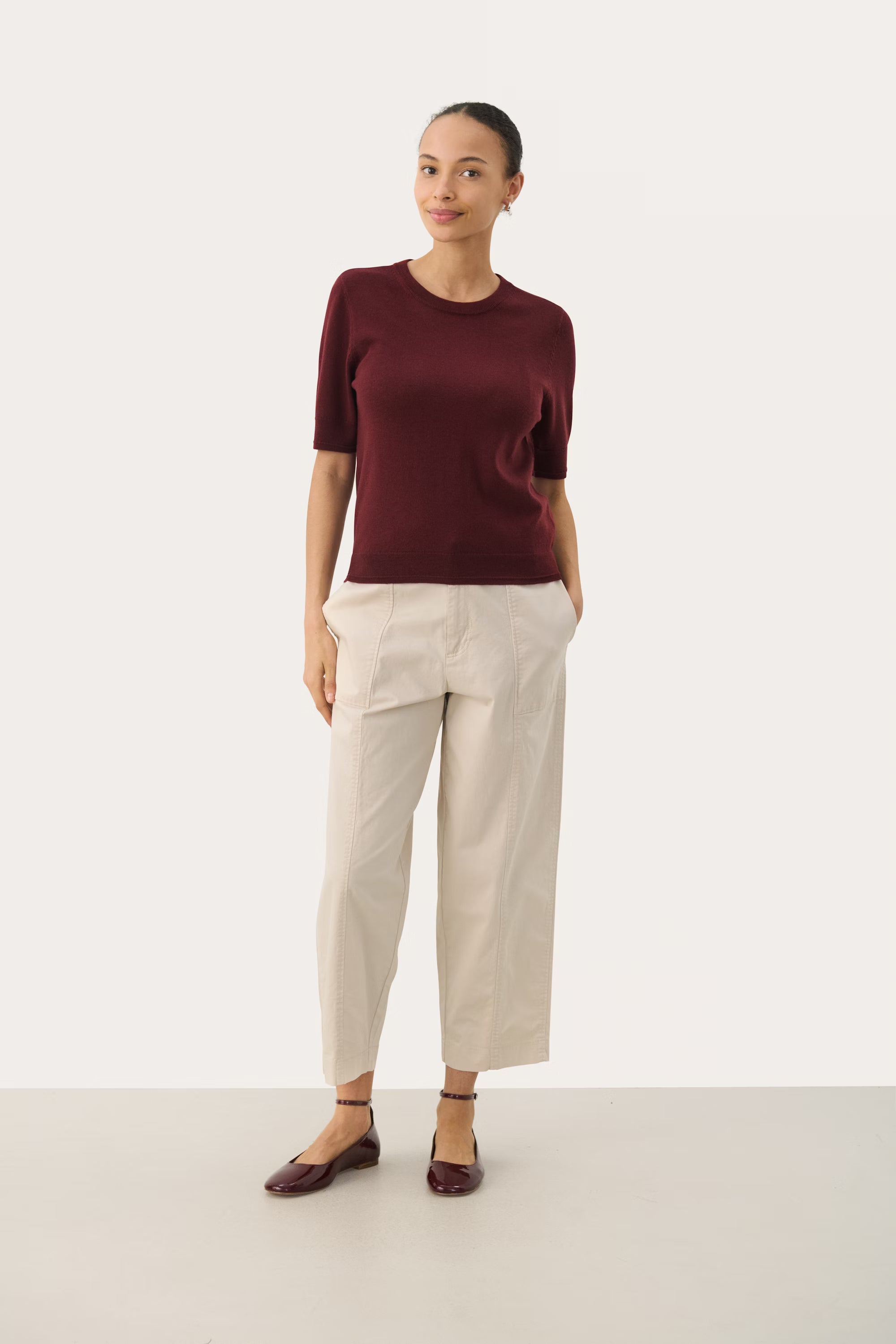 Part Twon lyhythihainen villaneule pyöreällä kauluksella. Materiaalina 100% villa. Hihoissa, kauluksessa ja helmassa resorit. Lämmin lyhythihainen villaneule on juuri sopiva valinta toimistolle. Pue siistien housujen, farkkujen tai hameen kanssa tyylikäs syysasu.