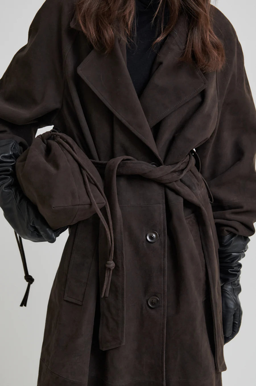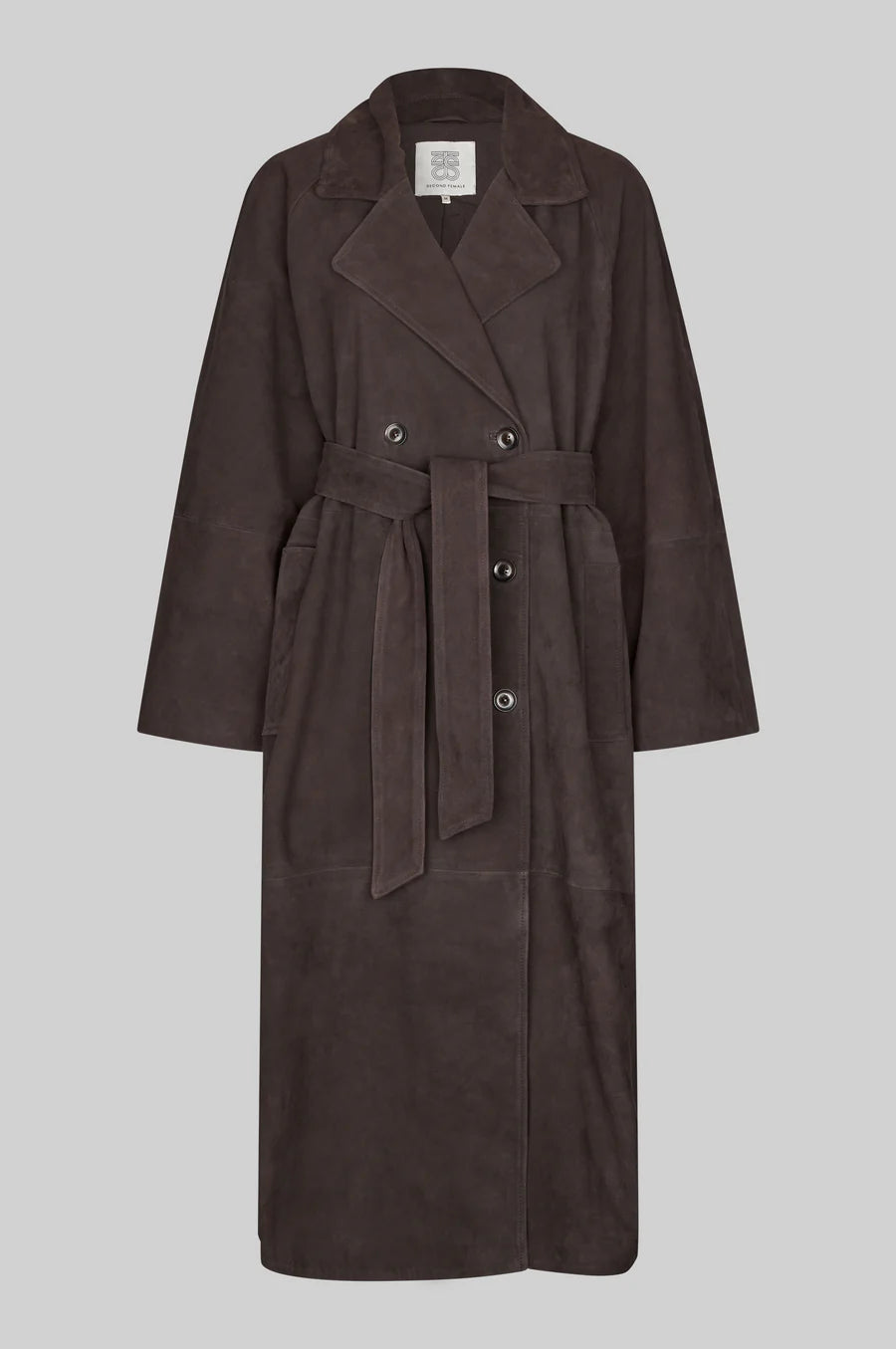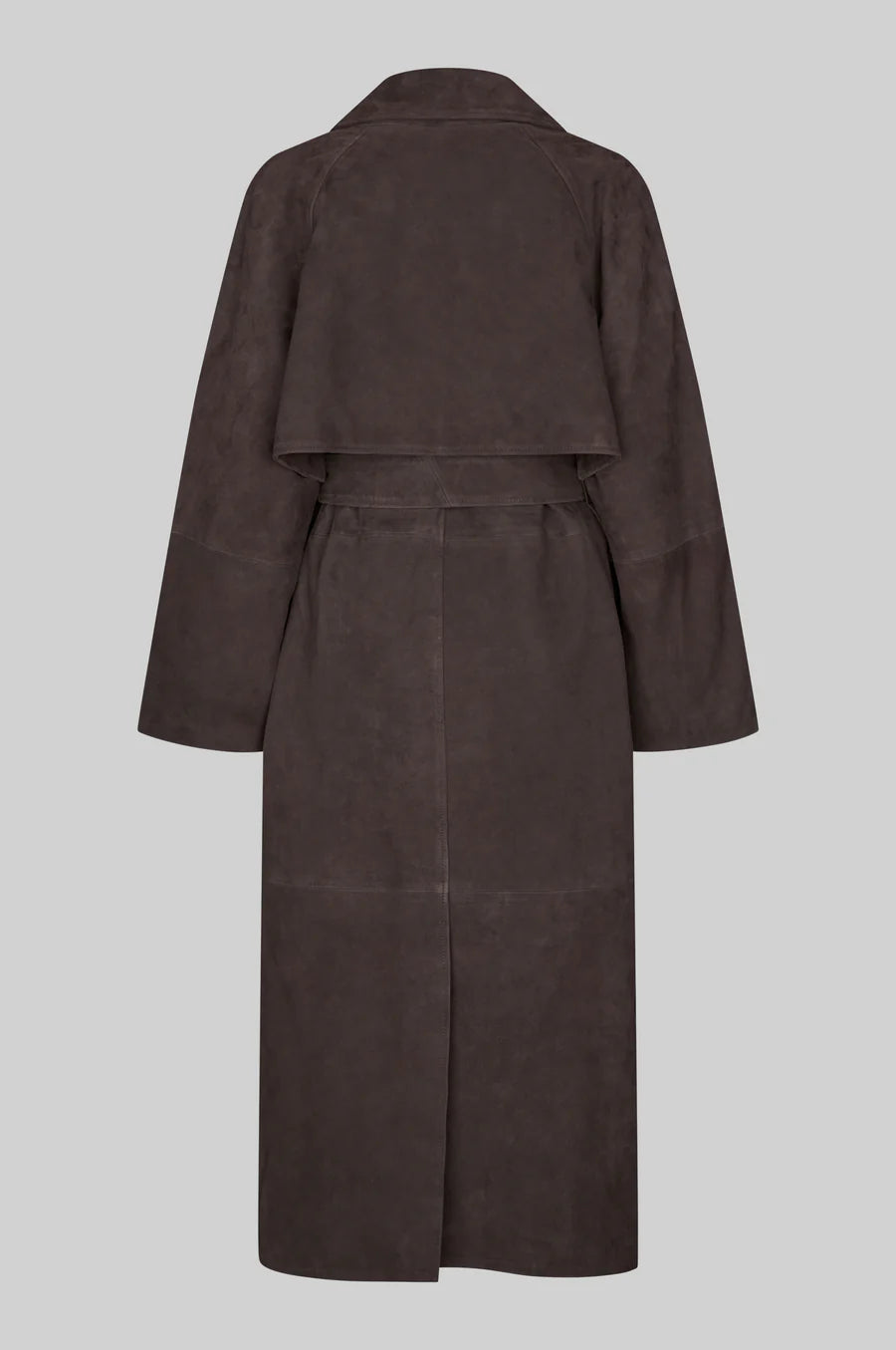Tämä pitkä trenssi on kokonaan vuoritettu. Materiaalina pehmoinen vuohennahka. Takissa on taskut ja irrotettava vyö. Rento, suoralinjainen malli.