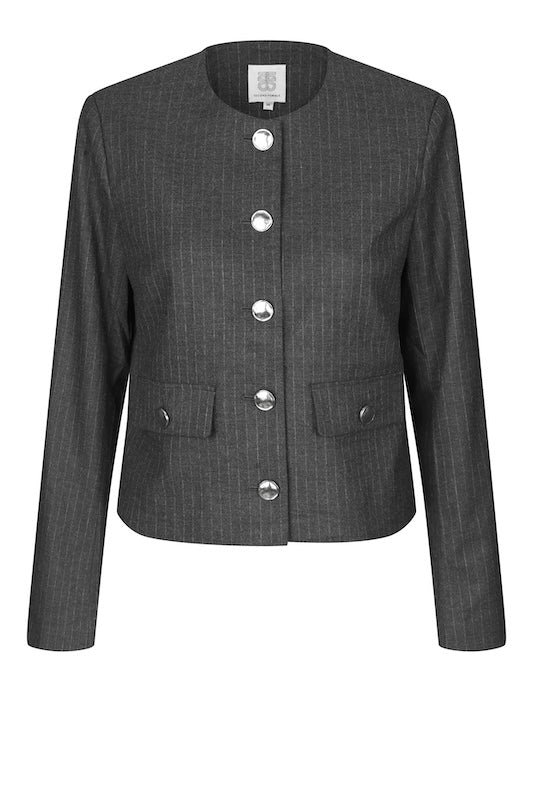 Second Femalen kaunis lyhyempi bleiseri näyttävillä hopean värisillä napeilla. Liituraitakuosi. Kaulukseton malli.