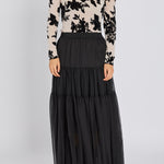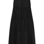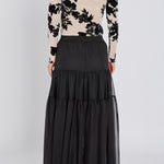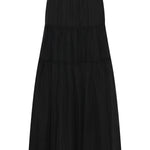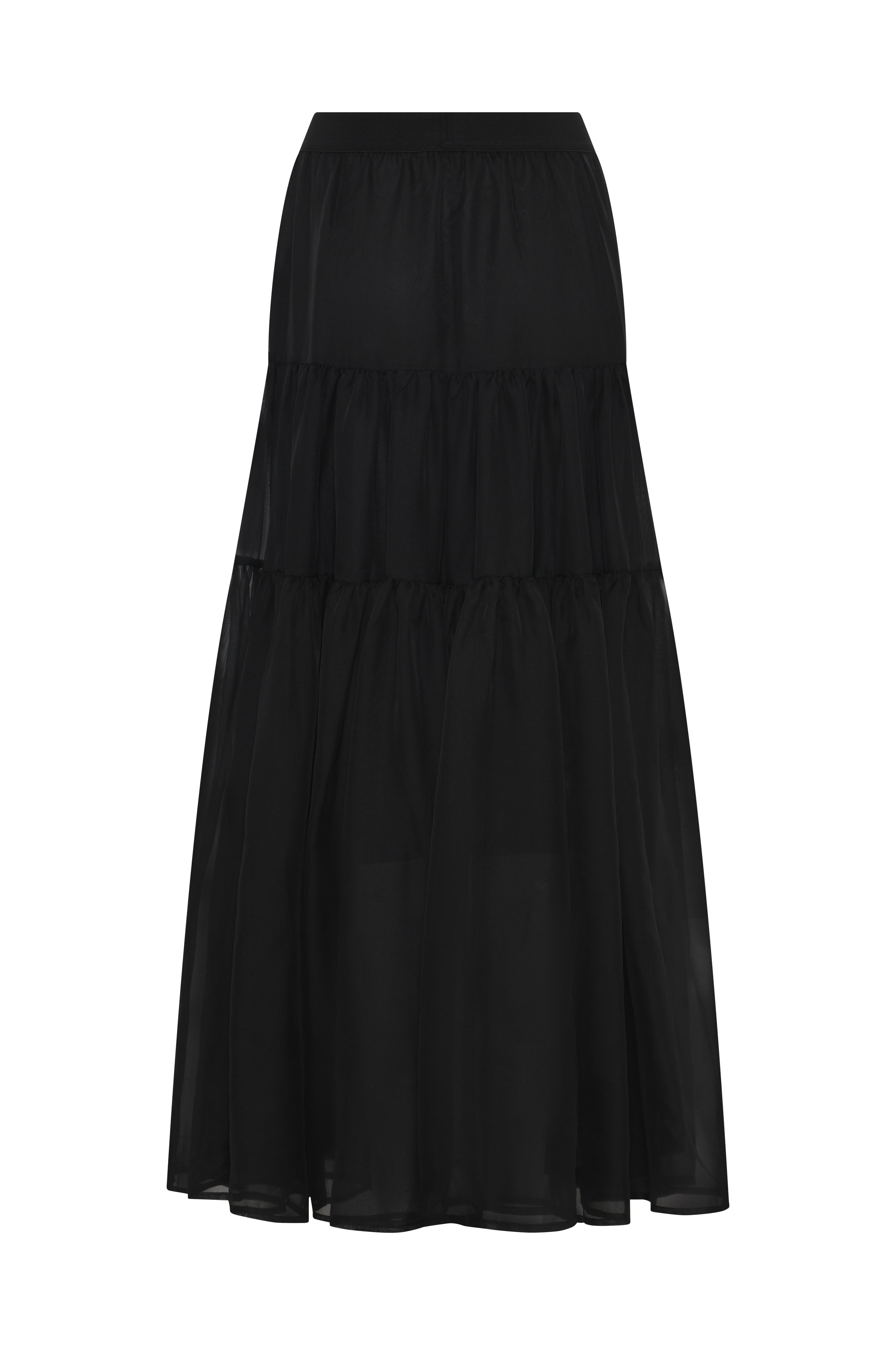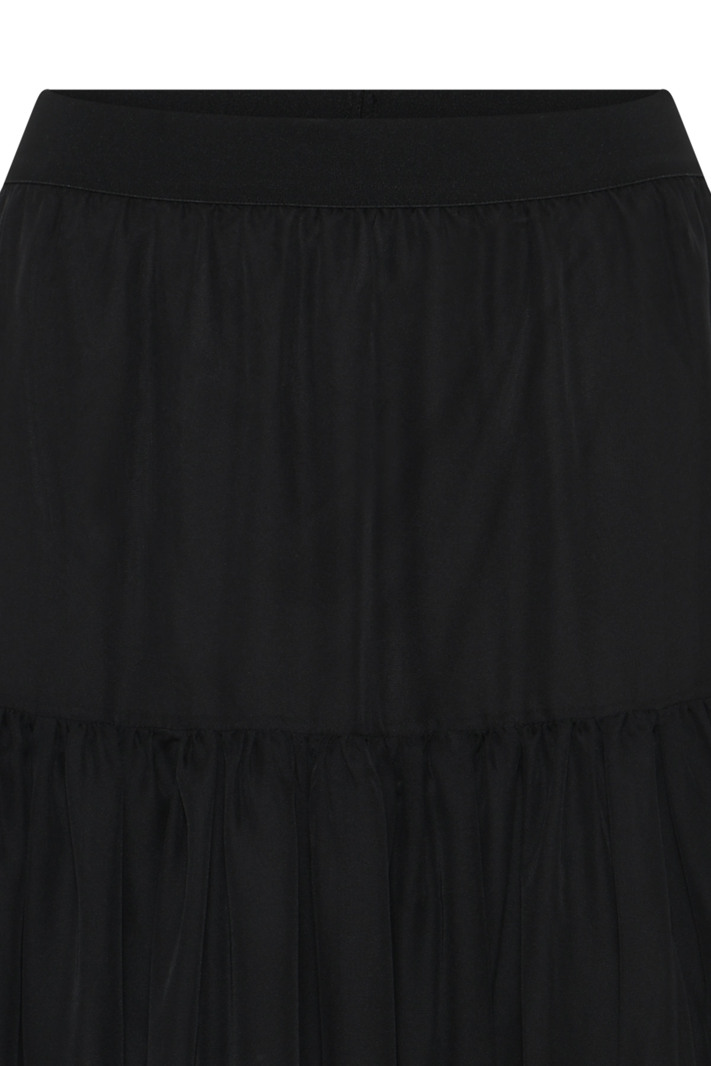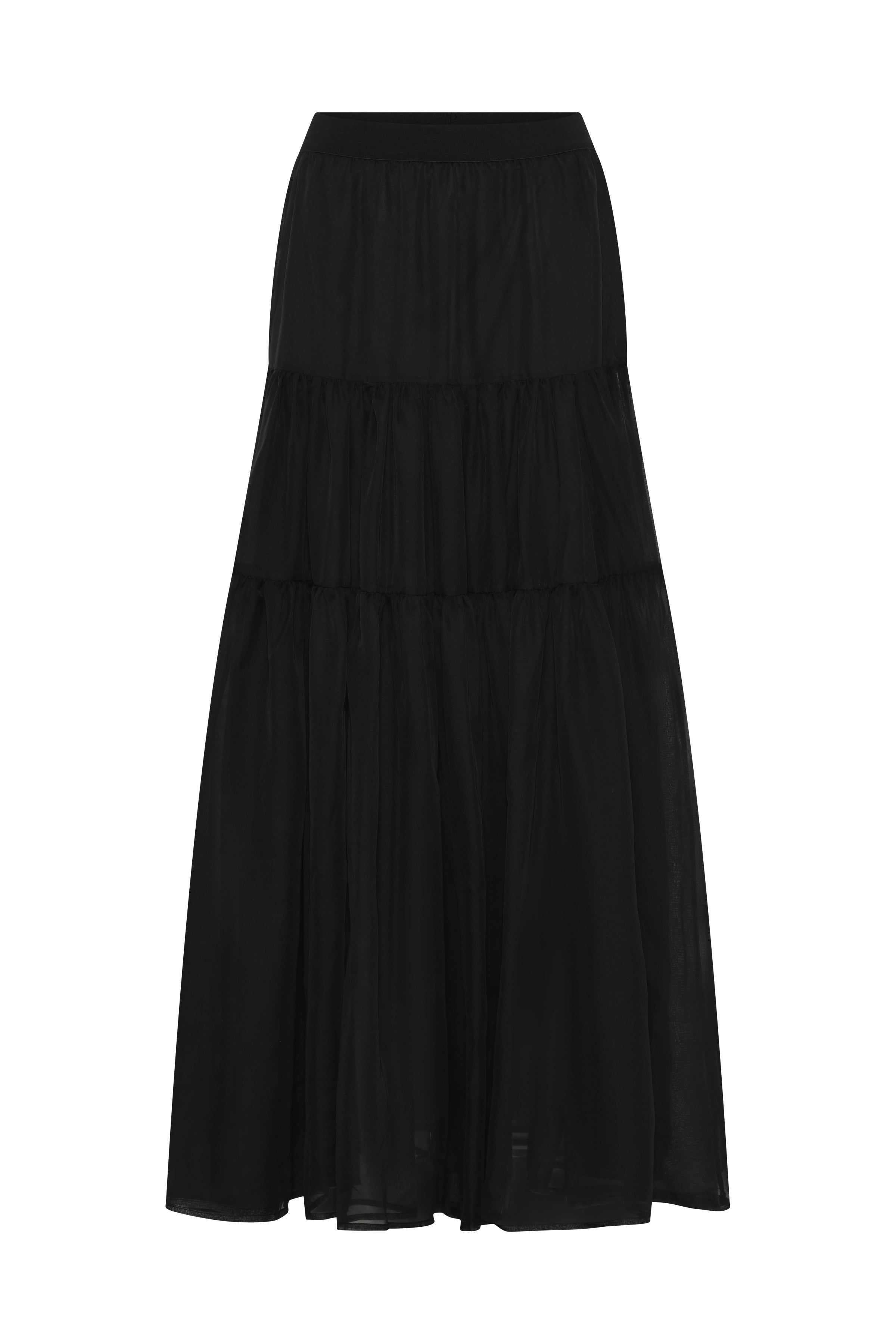 Bruuns Bazaarin musta maxihame, jossa on kauniisti liehuva helma. Ihana kerrostettu alaosa, jossa kuitenkin kevyt ilmava look. Hameessa on alushame ja vyötärössä joustava kuminauha. Yhdistä ihonmyötäisen yläosan ja saappaiden kanssa rento, mutta naisellinen asu.