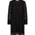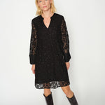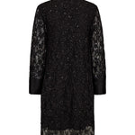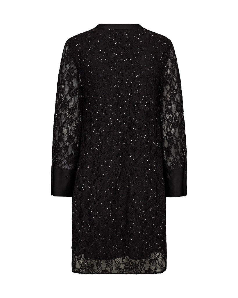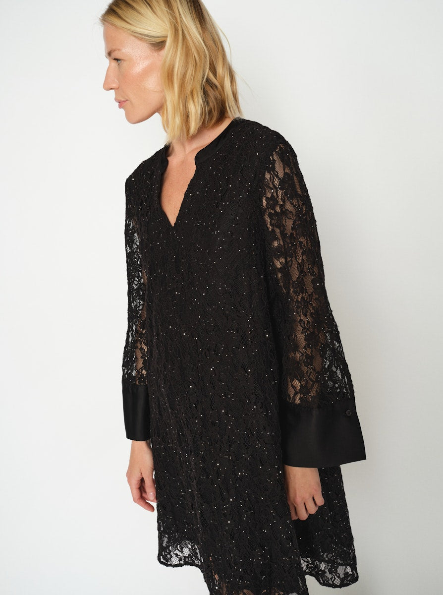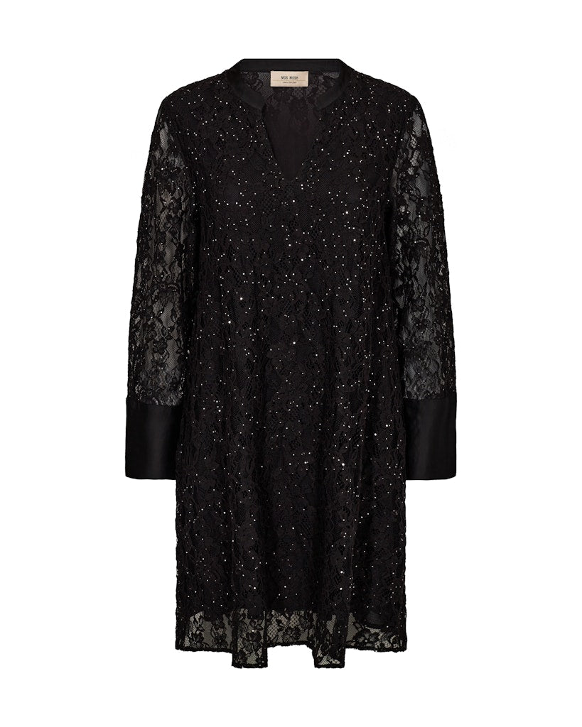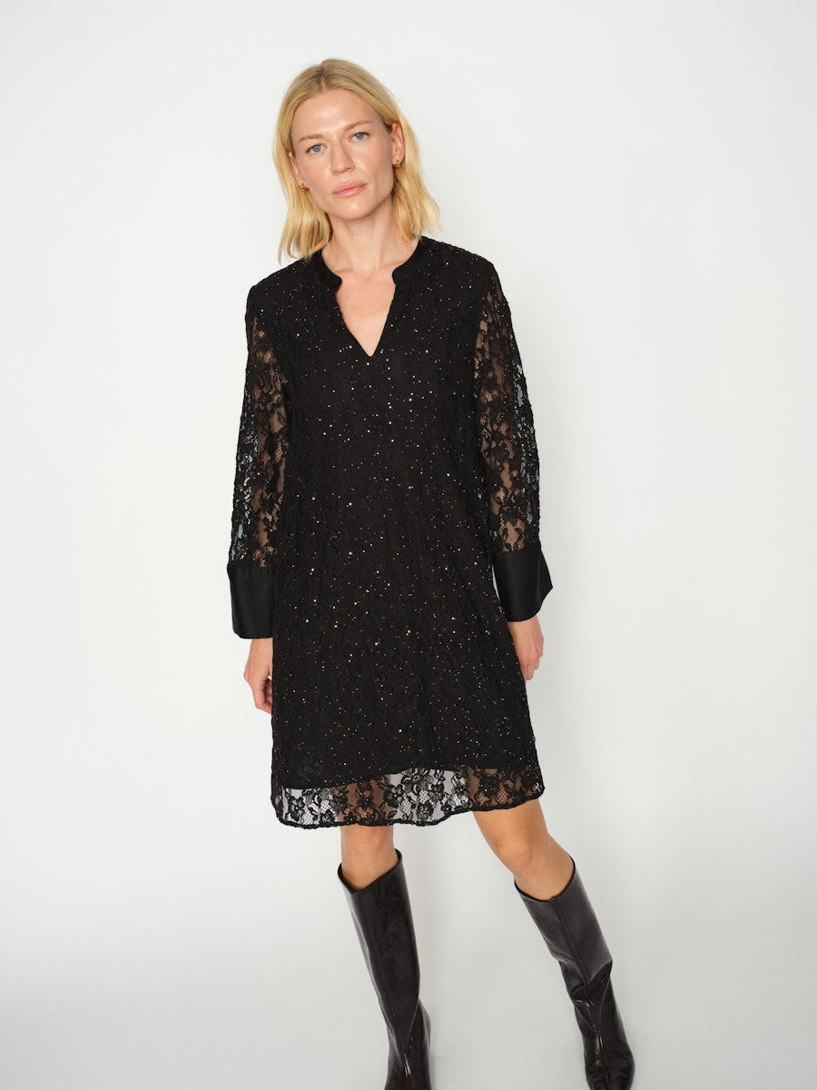 Näyttävä paljettimekko pitsikankaasta. Miehustaosassa alusmekko. Pitkät hihat ja v-kaula-aukko.