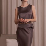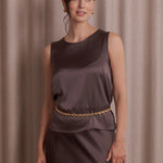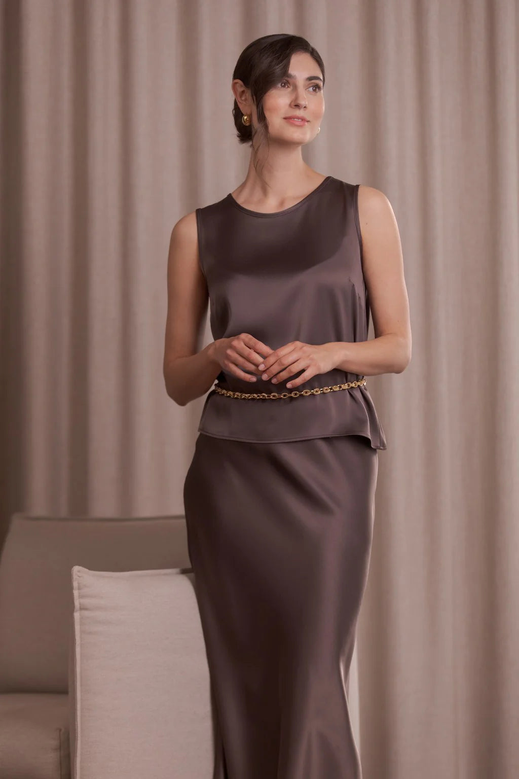 Pelkistetty hihaton triasetaatti satiinitoppi. Rintalaskokset sivuilla antavat istuvuutta ja ryhtiä. Hieman lyhyempi suoralinjainen helma. Kaula-aukko ja hihansuut viimeistelty reunanauhalla kauniisti.