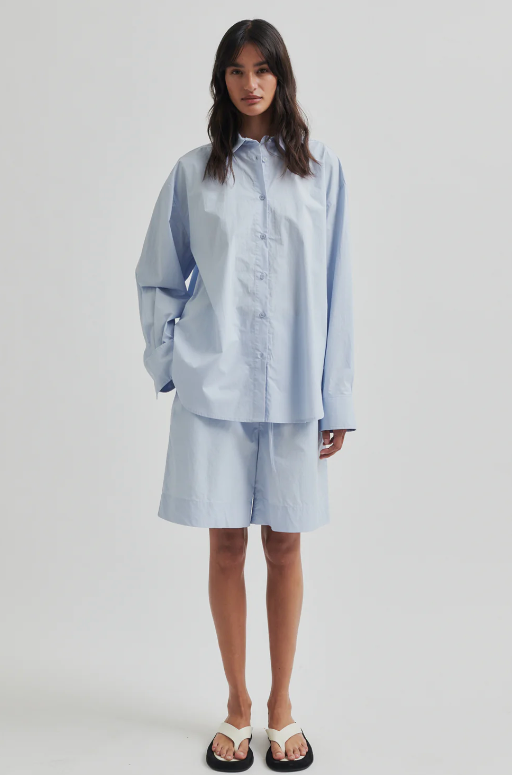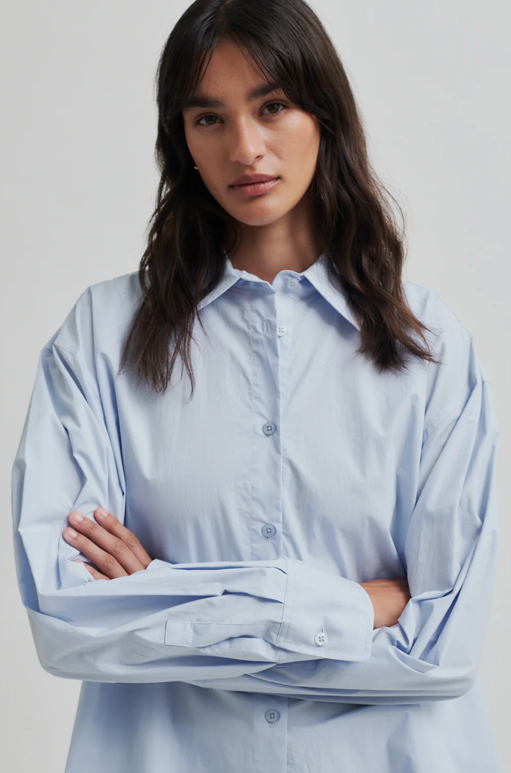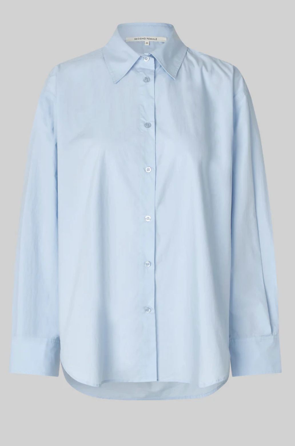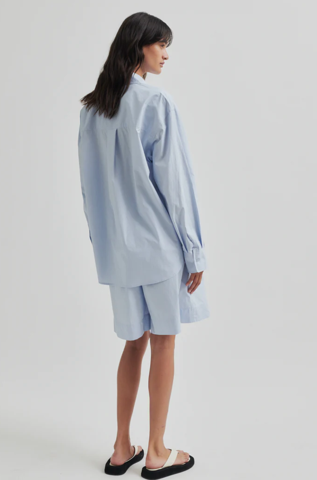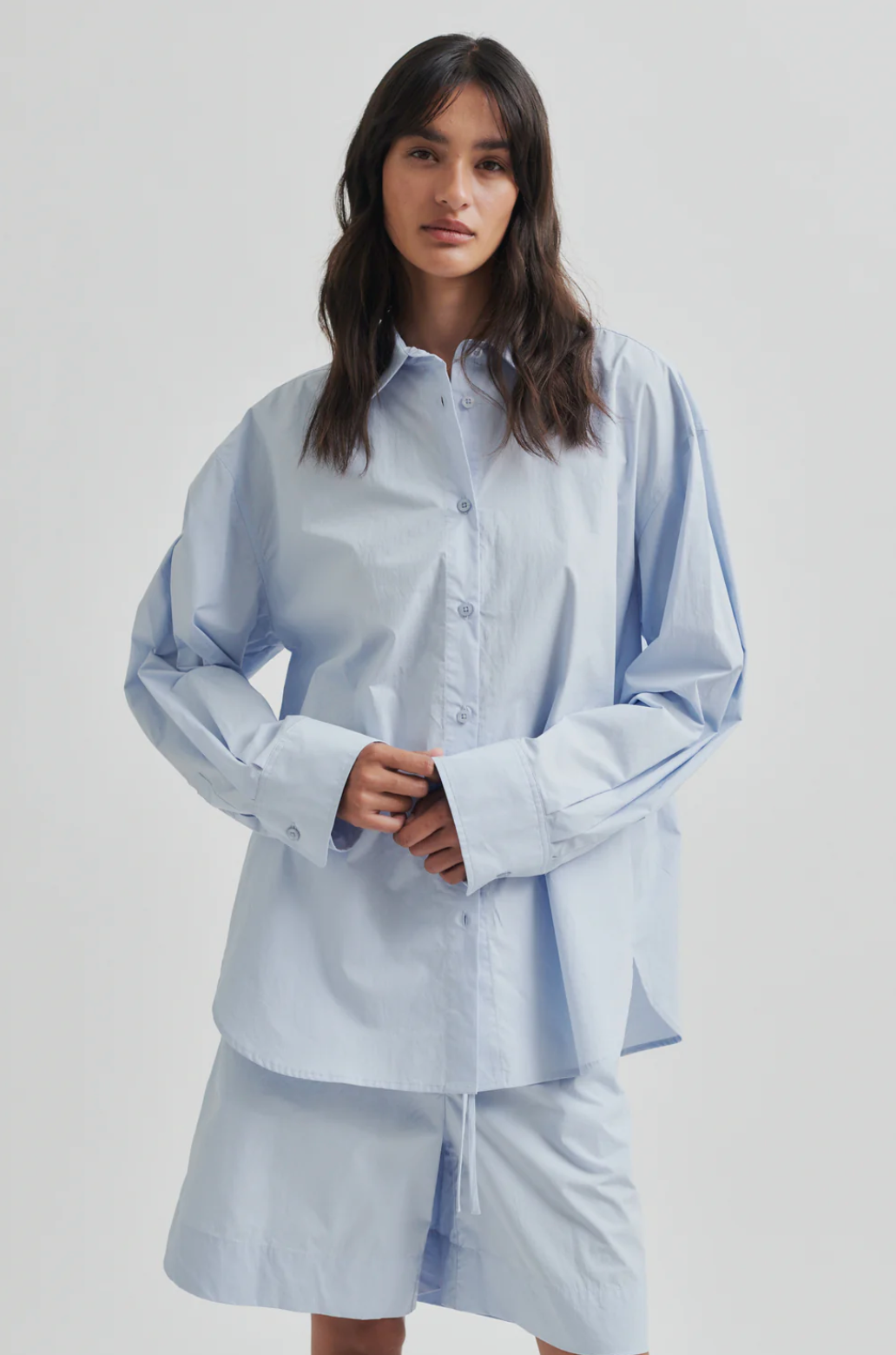 Rento paitapusero kauniissa vaaleansinisen sävyssä. Selkäpuolella laskos lisäämässä istuvuutta. Yhdistä rennosti shortsien tai pitkien housujen kanssa.