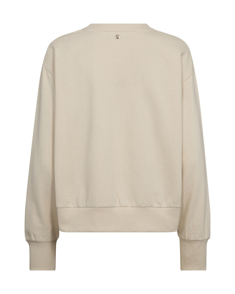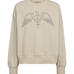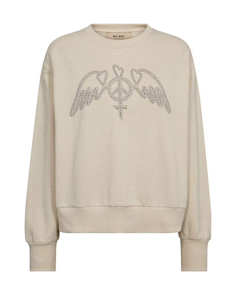 Mos Moshin rento collegepaita pehmeää collegeneulosta. Edessä Mos Moshin siipilogo kivalla glitterillä. Pyöreä pääntie ja resorit helmassa ja hihansuissa.