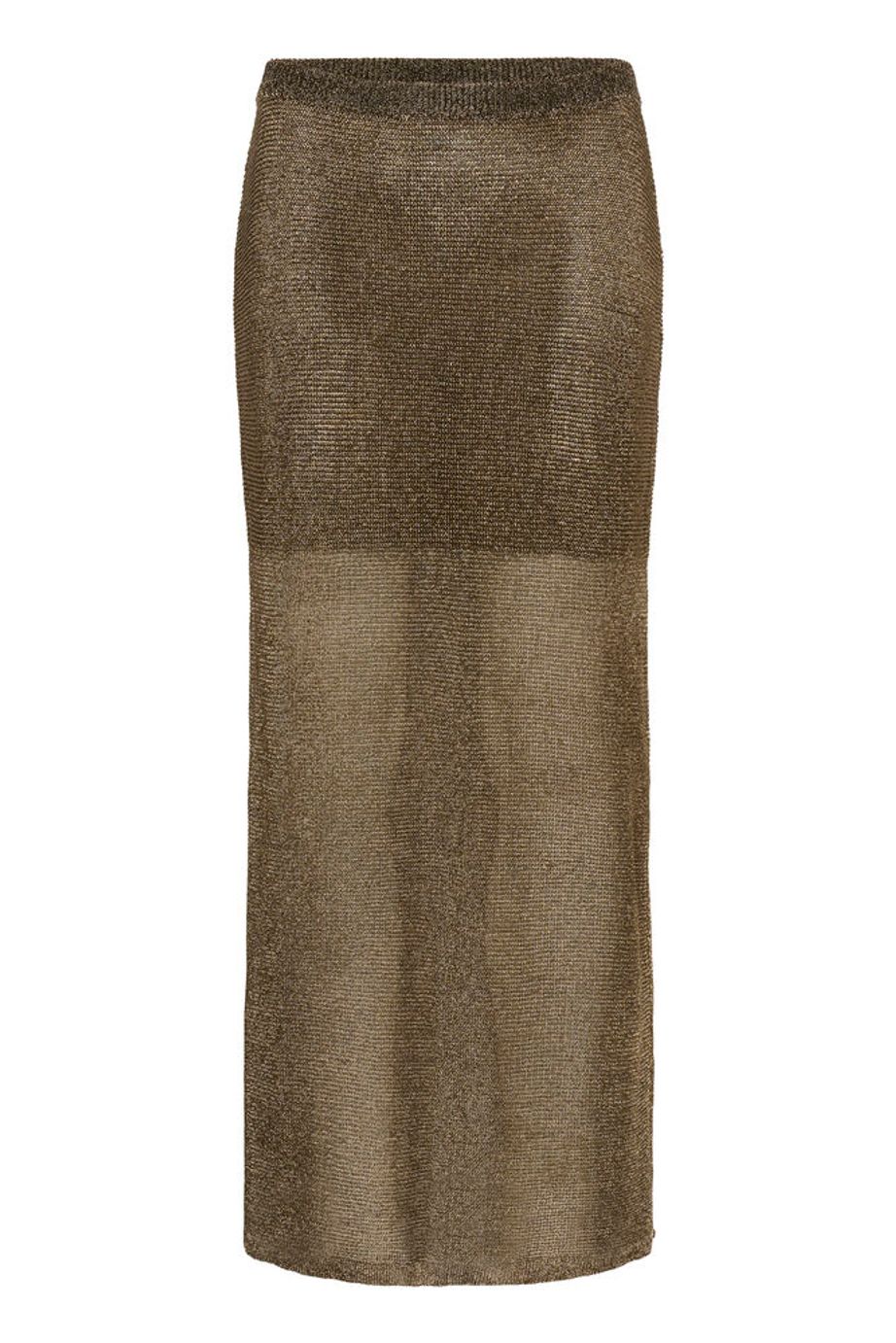 MEWin upea läpikuultava neulottu maxihame, jossa sivuilla halkiot. Hameen yläosassa tiheämpää neulosta. Neuloksessa kimaltavaa metallikuitua. Yhdistä saman sarjan Olly-topin kanssa tai pue päälle yksinkertainen yläosa. Näyttävä asu kauden juhlasesonkiin!