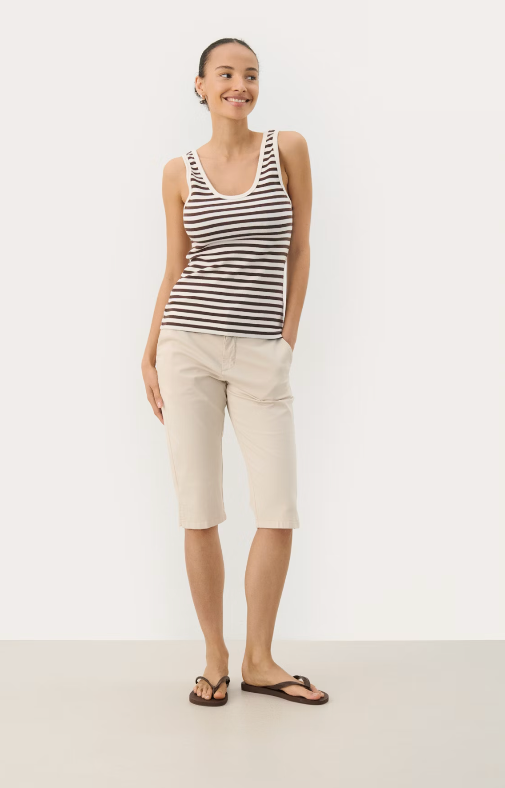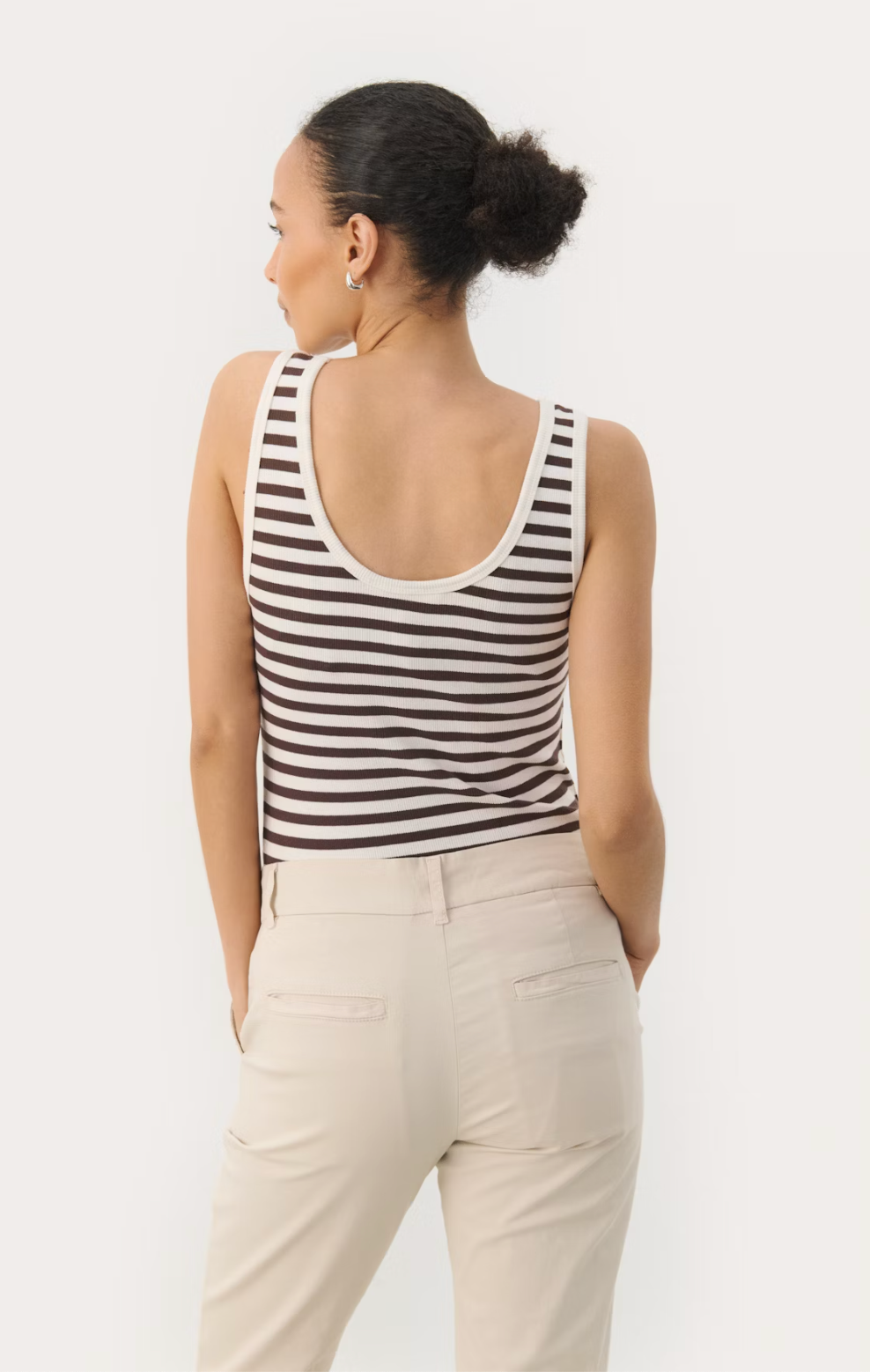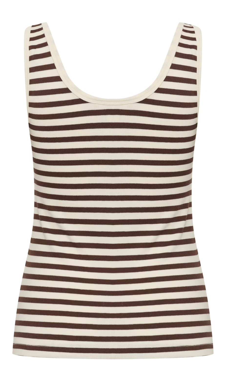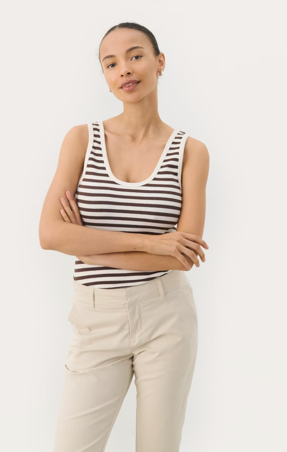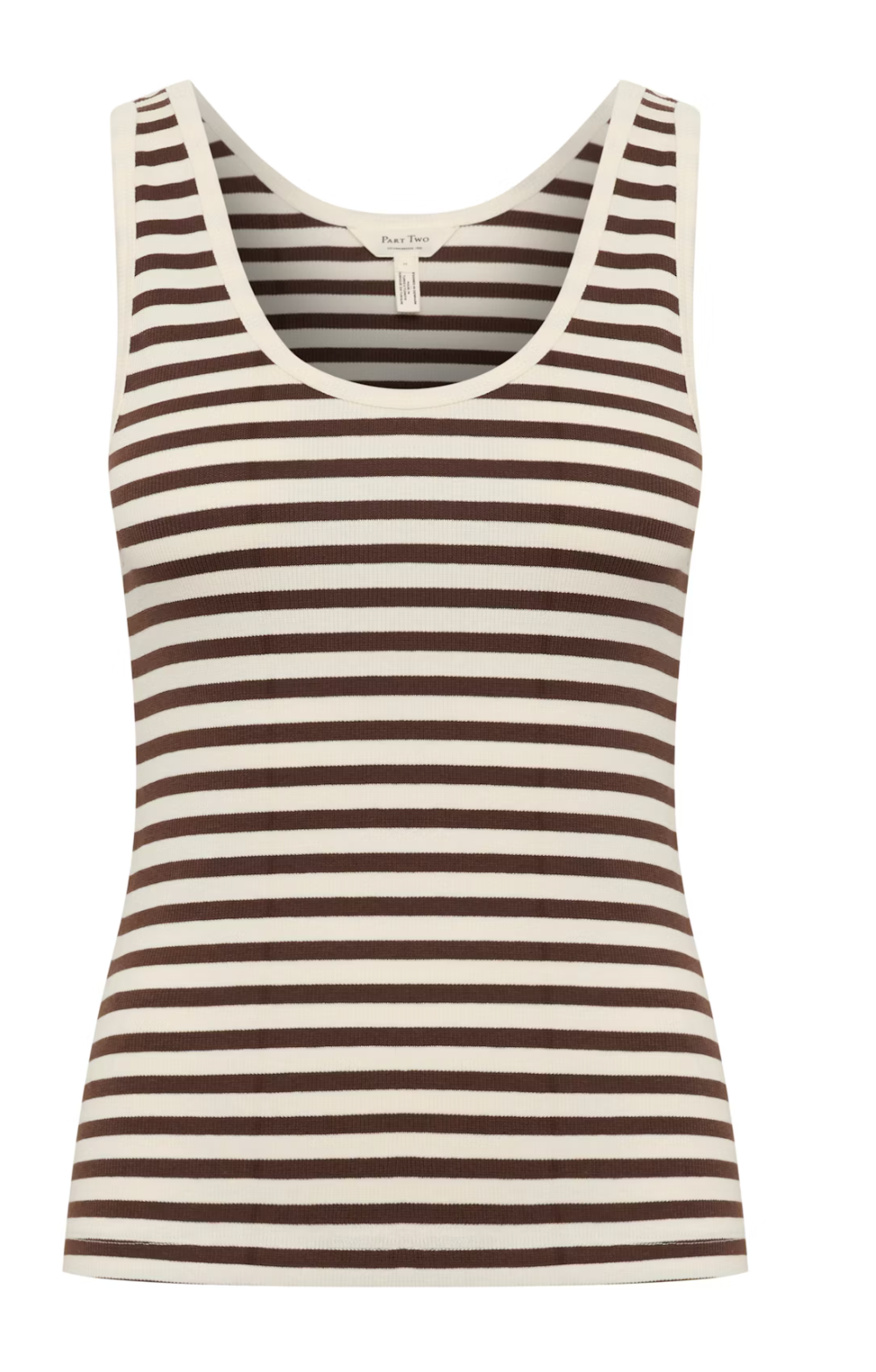 Part Twon ajaton trikootoppi kivaa ribbineulosta. Kesäinen toppi shortsien tai hameen kanssa. Toimii myös alustoppina neuleen tai vaikkapa bleiserin alla. Tässä topissa ruskeita raitoja luonnonvalkoisella pohjalla. Monta mukavaa sävyä!