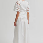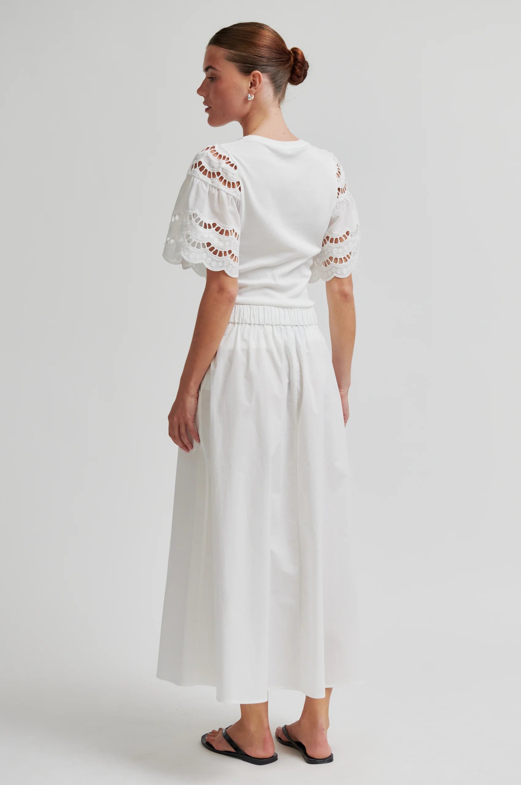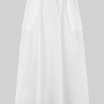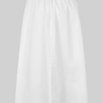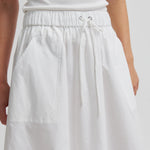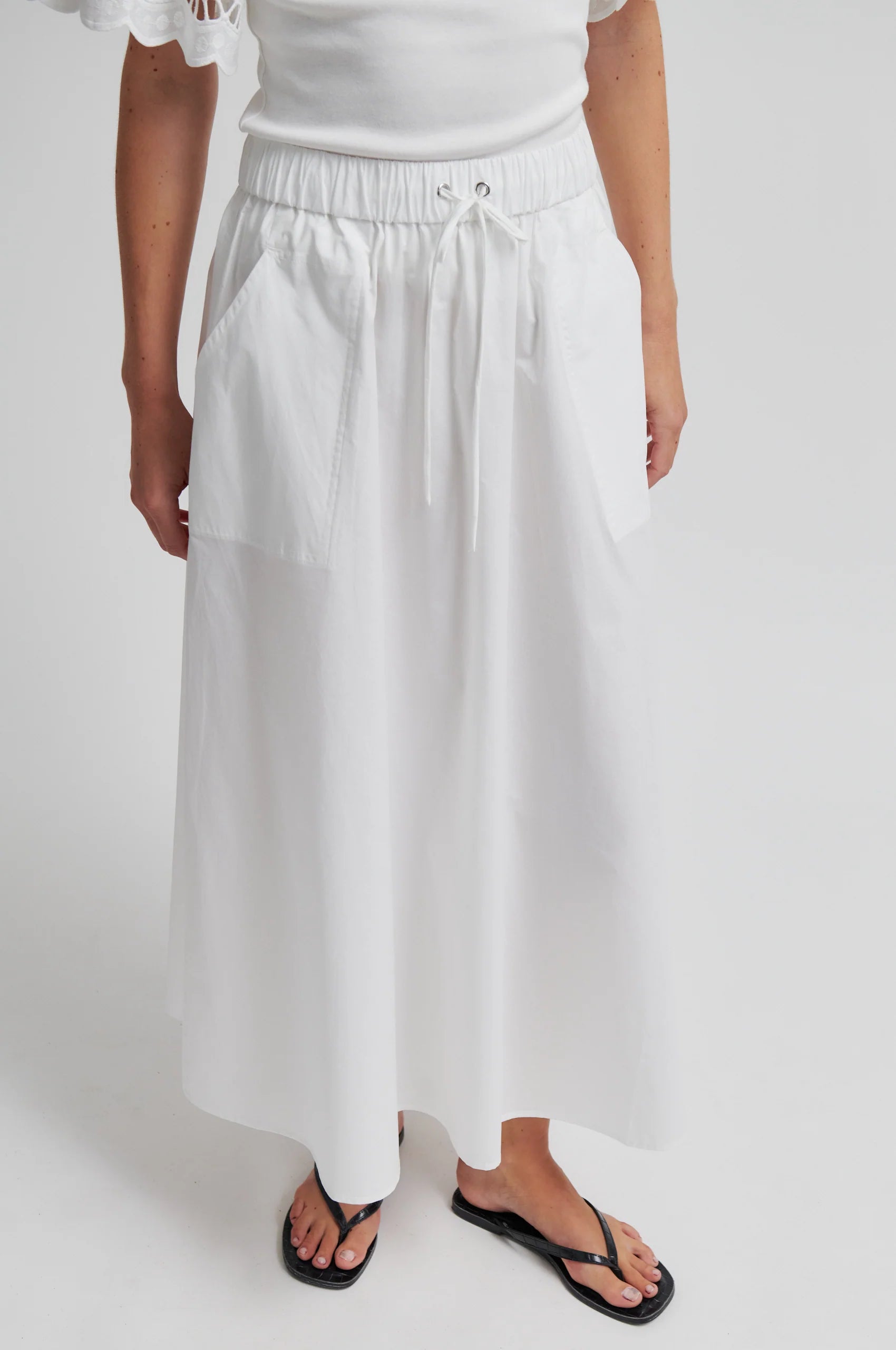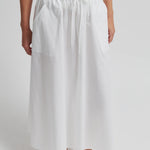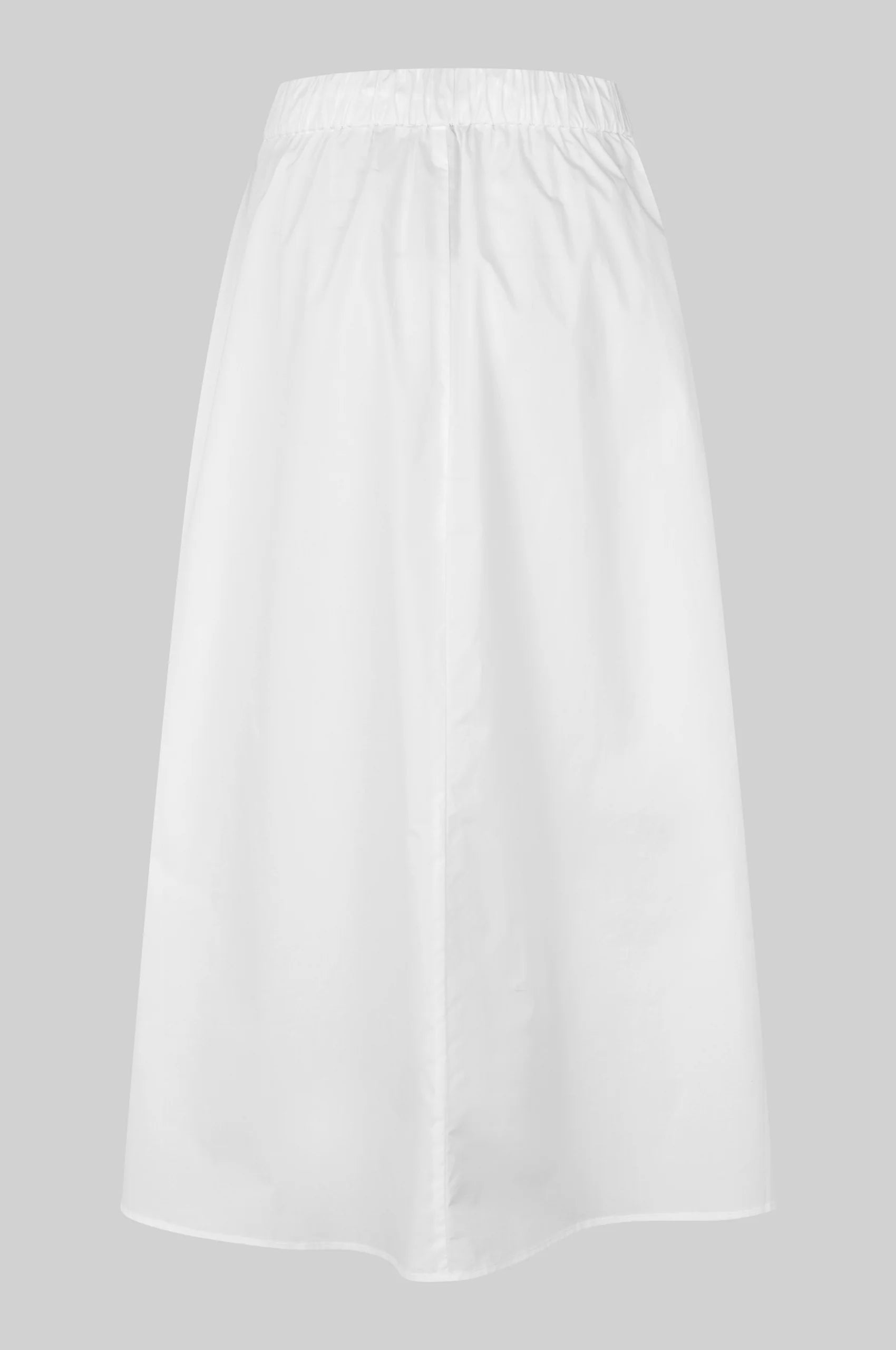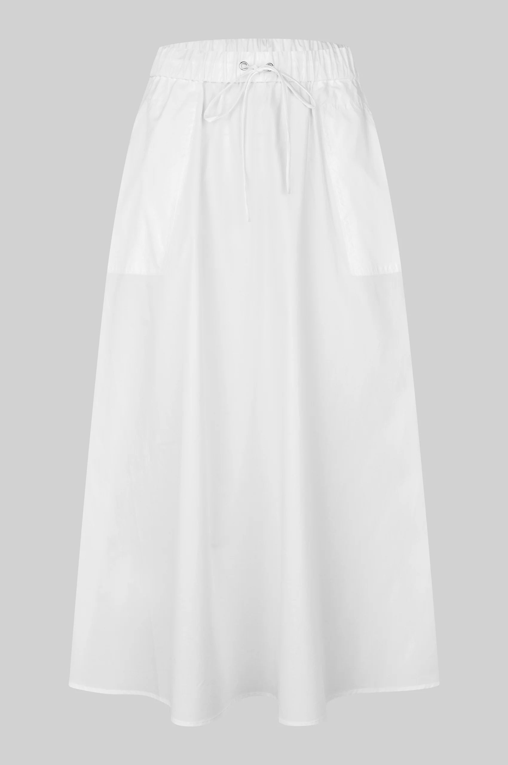 Valkoinen maksipituinen hame, jossa klassinen A-linjainen malli. Hameessa nyörit ja joustava kuminauhavyötärö. Materiaalina 100% luomupuuvilla. Raikas ja ajaton vaatekaapin peruspilari.