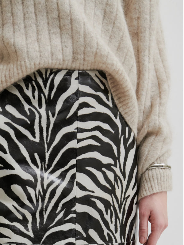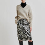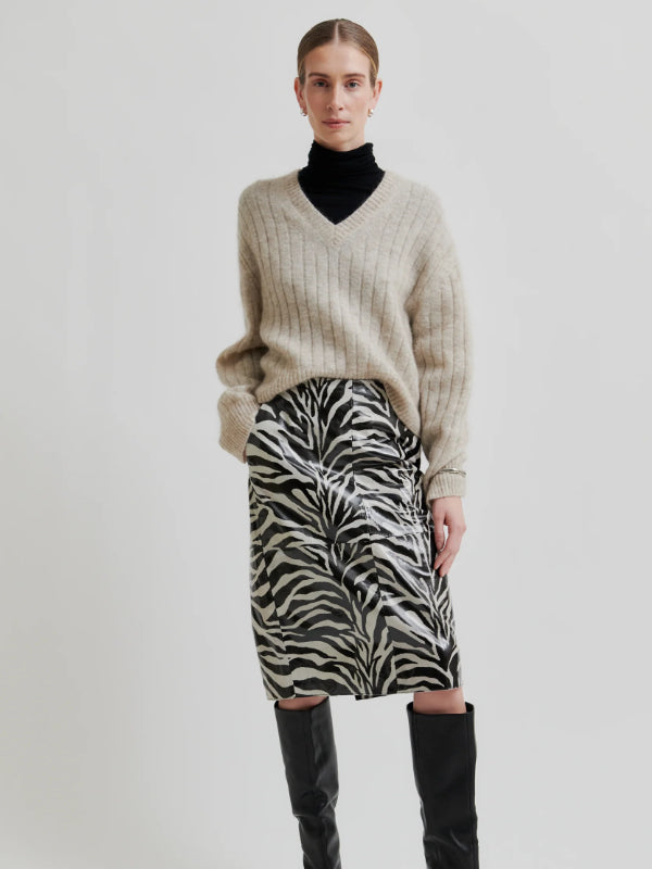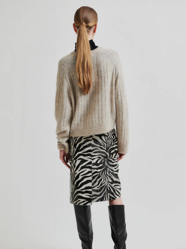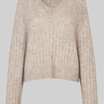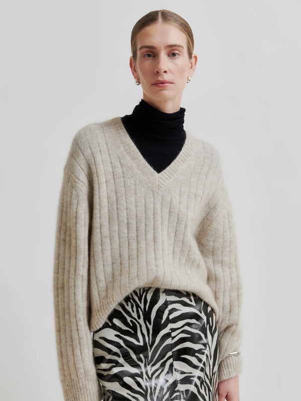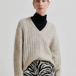 Second Femalen ribattu neulepusero V-kaula-aukolla. Tämä pehmeä ja joustava neule on valmistettu mohair-villasekoitteesta ja siinä on hieman pörröinen tekstuuri. Villaneuleen kaula-aukossa, hihoissa ja helmassa on ohuempi ribattu neulos. Rento malli.