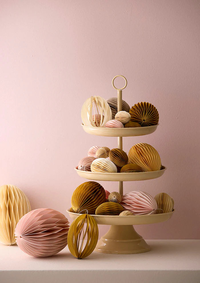 Kaunis paperinen munan mallinen koriste pääsiäiseen. Myydään 2kpl seteissä. Värinä beigen sävyt. Voit kasata koristeen säilytykseen ja avata sen pyöreäksi magneetilla.