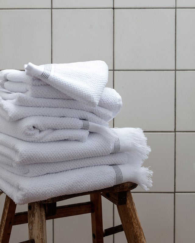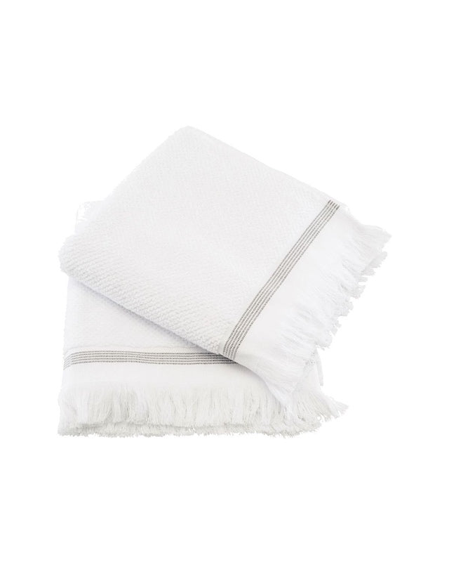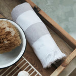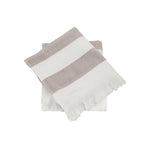 Merakin kaunis käsipyyhe, joka myydään kahden pyyhkeen settinä. Kauniit raidat luonnollisissa sävyissä. Hapsut viimeistelevät ilmeen.