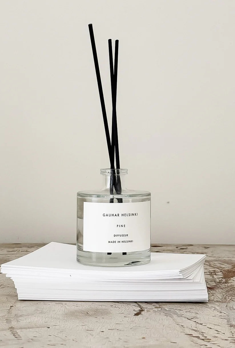 Kotimaisen Gauhar Helsingin raikas, metsäinen huonetuoksu Pine. Pakkauksessa mukana 6 kpl puista tuoksutikkua.