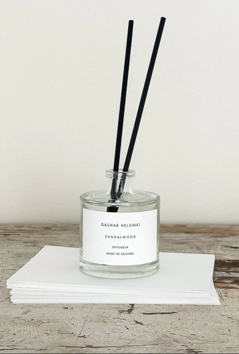 Kotimaisen Gauhar Helsingin raikas, metsäinen huonetuoksu Sandalwood. Pakkauksessa mukana 6 kpl puista tuoksutikkua.
