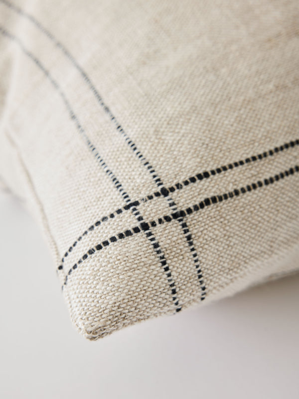 Tell Me Moren pellava tyynynpäällinen, jossa reunoilla mustat kudotut raitayksityiskohdat. Tämä tyynynpäällinen tuo ihanaa luonnollisuutta sisustukseesi. Piilovetoketjukiinnitys.