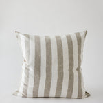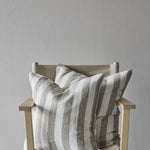 Tell Me Moren kaunis klassisen raidallinen tyynynpäällinen pestyä pellavaa. Tyynynpäällisen takana tyynyn pujotusaukko.