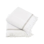 Merakin kaunis käsipyyhe valkoisena, jossa pieni harmaa raita ja hapsut. Koko 50x100cm, täydellinen hiuspyyhkeeksi tai suuremmaksi käsipyyhkeeksi. Nämä pyyhkeet ovat ihanan pehmeitä, 100% luomupuuvillaa!