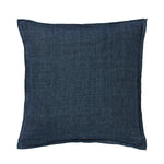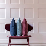 Bungalowin ajaton yksivärinen tyynynpäällinen kivipestyä pellavaa. Tyynyssä kauniit tereompeleet reunassa.