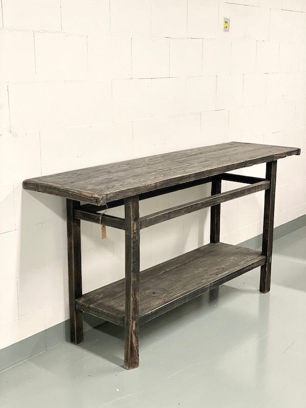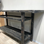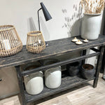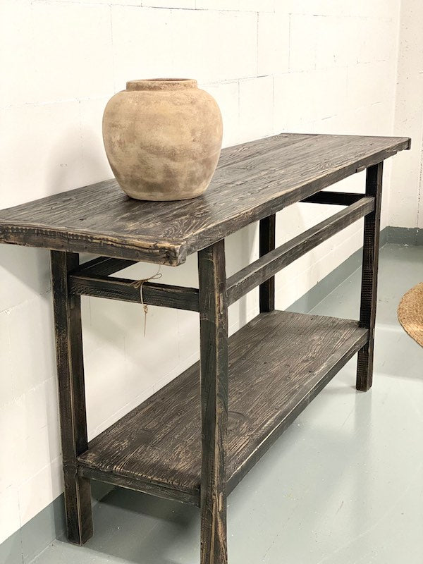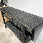 Kaunis kuluneen mustan sävyinen pitkä sivupöytä eläväisellä pinnalla. Tässä sivupöydässä on hylly, jonne voit laittaa esim. koreja, kirjoja tms. Eteiseen, keittiöön tai makuuhuoneeseen aina tarpeen ja fiiliksen mukaan. Rosoisista puuhuonekaluistamme syntyy luonnollinen ilme kotiisi!
