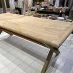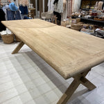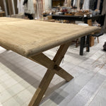 Snowdrops Copenhagenin ihastuttava natural-sävyinen ruokapöytä luo kotiisi pehmeän, luonnollisen tunnelman. Kansiosa on vanha ovi ja se on tehty jalavasta. X-mallinen jalkaosa on mäntyä ja se on tehty sopivaksi skandinaaviseen tyyliin.