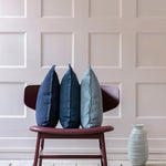 Bungalowin ajaton yksivärinen tyynynpäällinen kivipestyä pellavaa. Tyynyssä kauniit tereompeleet reunassa.