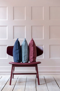 Bungalowin ajaton yksivärinen tyynynpäällinen kivipestyä pellavaa. Tyynyssä kauniit tereompeleet reunassa.