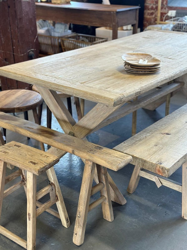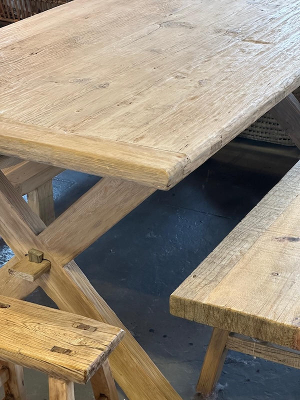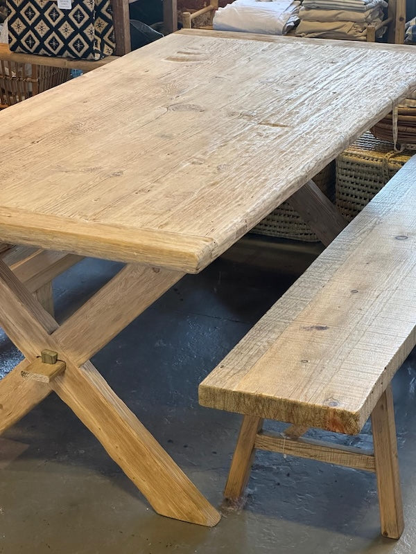 Snowdrops Copenhagenin ihastuttava natural sävyinen ruokapöytä luo kotiisi pehmeän, luonnollisen tunnelman. Kansiosa on vanha ovi ja se on tehty jalavasta. X-mallinen runko on mäntyä ja se on tehty sopivaksi skandinaaviseen tyyliin. Sopivan rouhea yksilö. Our darling!
