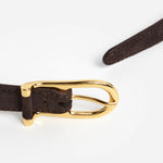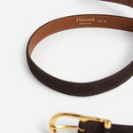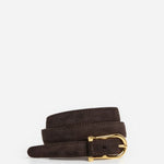 Flatteredin mokkainen nahkavyö suklaanruskeassa sävyssä. Vyö sopii täydellisesti farkkujen ja shortsien kanssa. Vyössä kullan värinen metallisolki. Saatavilla kahdessa koossa.