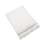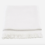 Merakin kaunis kylpypyyhe valkoisena, jossa pieni harmaa raita ja hapsut. Koko 70x140cm. Nämä pyyhkeet ovat ihanan pehmeitä, 100% luomupuuvillaa!