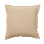 Bungalowin ajaton yksivärinen tyynynpäällinen kivipestyä pellavaa. Tyynyssä kauniit tereompeleet reunassa.